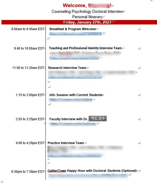 사실 인터뷰 준비에 정말 감사하게 많은 도움을 받았기에 쓰지 않을 수 없다. 개인적으로 네이버에서 미국 상담심리 박사 과정 인터뷰 후기를 찾아보던 중, 한국인 재학생 선생님이 게시한 모의 인터뷰를 도와준다는 블로그 글을 발견했다. 당시 절박한 마음으로 신청을 했고, 총 두 번의 모의면접을 보고 피드백을 받을 수 있었다. 경험이 있는 선생님과 모의면접을 해보고 피드백으로 보완하니 긴장도 줄어들고, 한층 자신감이 생겼다.