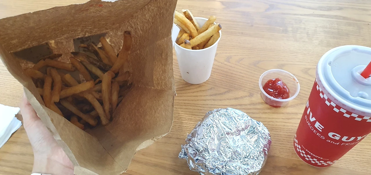 아주 따뜻하고 지지적인 소란의 가사에 위로를 받고, 맛있는 밥으로 기력도 보충하고 셀프 격려도 할 겸 파이브가이스 버거로 향했다. 치즈 버거와 프렌치프라이, 콜라를 야무지게 시켜서 입안 한가득 때려 넣었다. 감자를 스몰 사이즈로 주문했는데 차고 넘-치게 줘서 기분이 좋았다. 역시 기분전환은 탄수화물이 최고다!