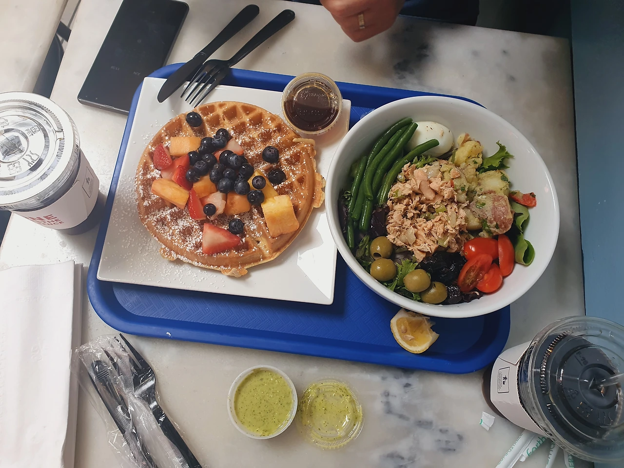 실내가 보기보다 좁아서 간신히 자리를 잡고 벨지안 와플과 연어샐러드, 그리고 커피를 주문했다. 와플과 샐러드 둘 다 너무 맛있었다. 개인적으로 디씨에 와서 먹은 것 중에 베스트였다. 와플도 폭신폭신하니 달달해서 맛없기 어려웠거니와, 여러 식재료가 잔뜩 들어간 샐러드도 훌륭했다. 다른 메뉴도 한 번씩 다 먹어보고 싶었던 브런치 카페다.