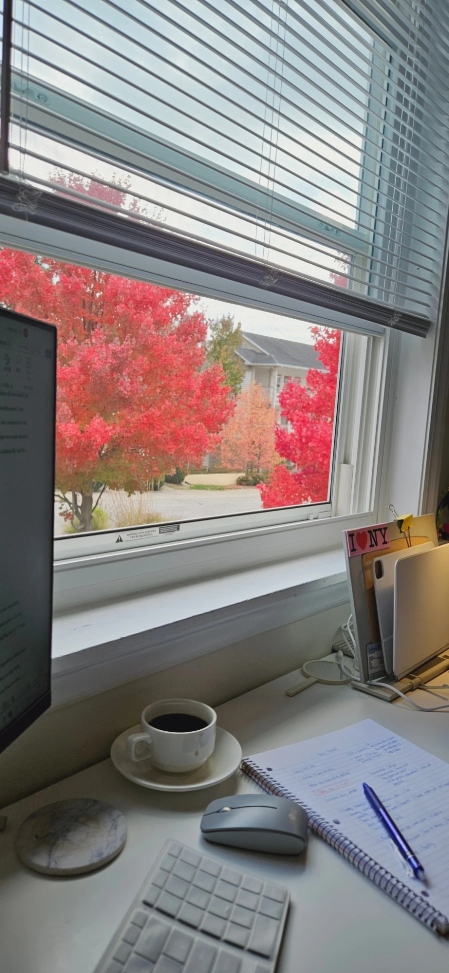 다시 공부, 공부, 일, 일, 일, 일. 단풍이 가장 예쁜 주말이었다. 주말이 어떻게 갔는지도 모르게 집에서 과제와 일만 했던 것 같다. 그냥....... 정신을 차려보니 며칠이 지나있었다. 아쉬운 대로 가을바람이라도 맞으려 창문을 있는 대로 열어젖히고 산들거리는 바람과 커피로 마음을 달래며 일만 했던 시간이다. 단풍 구경 한 번도 제대로 못 간 이번 가을이 못내 아쉽지만, 그 욕구 다 참아가며 할 거 잘한 스스로에게 크레딧을 주고 싶다.