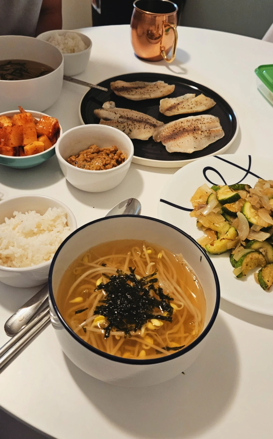 귀찮아서 대충 뚝딱 차린 담백한 밥상. 콩나물국에 앞서 말한 흰 살 생선구이, 호박 양파 볶음, 깍두기와 나또. 친구가 집에 초대했을 때, 호박 양파 볶음을 해줬는데 맛있어서 레시피를 배워와서 따라 해보았다. 새우젓은 배신하지 않았다. 맛있다. 별거 없는 어찌 보면 심심한 집밥인데 남편이 잘 먹어줘서 고맙다.