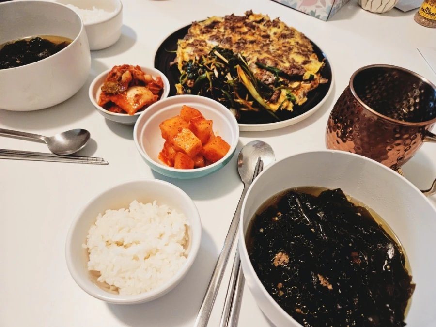 소고기 미역국과 간편식 육전, 그리고 파채, 김치로 차린 남편 생일상이다. 다소 소탈하지만 언제 먹어도 맛있는 메뉴들이다. 유튜브에 육전 쉽게 하는 버전의 레시피가 많이 도는데, 쉽게 해볼 만했다. 다만, 미국의 얇은 소고기는 기름기가 너무 적어서 조금 뻑뻑한 점이 아쉬웠다.