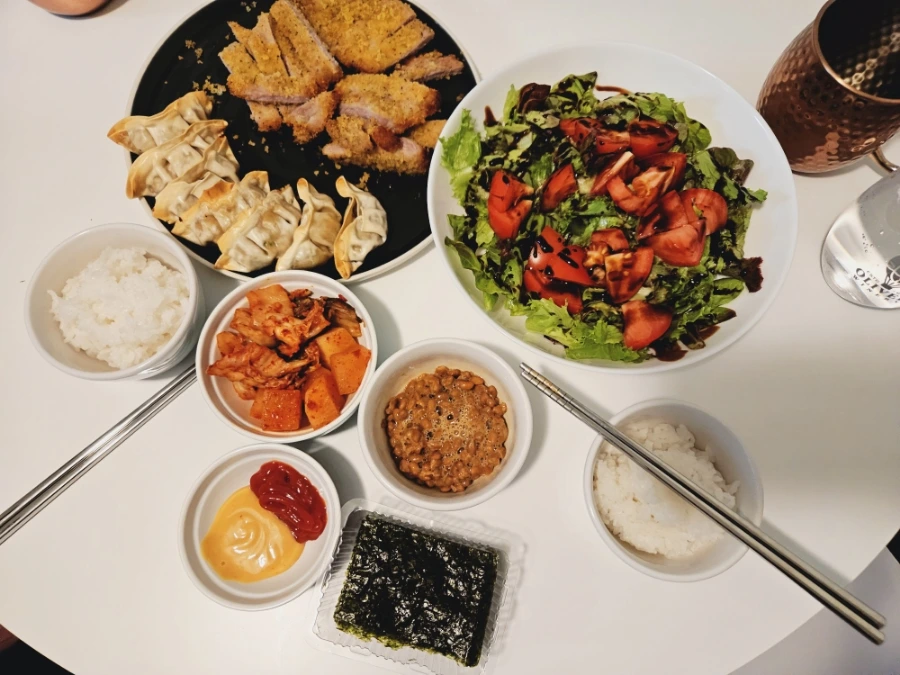미국 마트에서 파는 돈가스(?)와 군만두를 에어프라이에 담백하고 바삭하게 튀겨내고 샐러드와 배추김치, 깍두기, 김, 그리고 낫또와 함께 차려 먹었다. 사실 돈가스와 군만두는 남편 존이고, 김치, 낫또, 김은 아내 존이다. 극명하게 나뉜다. 소신 발언 하나 남기겠다 -개인적으로 낫또가 돈가스보다 훨씬 맛있다.