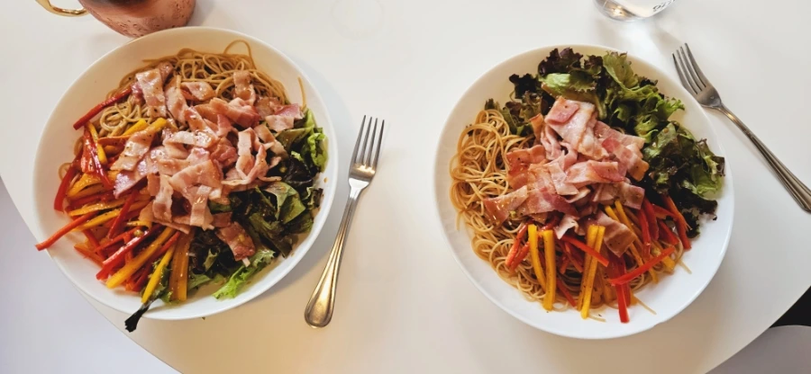 미즈 컨테이너를 위협하는 우리 집 시그니처 메뉴 중 하나인 샐러드 파스타다. 베이컨 듬뿍 구워올리고, 삼색 파프리카와 채소를 아낌없이 넣고 통밀 엔젤헤어 파스타를 삶아 넣은 초간단 집밥이다. 만들기도 참 쉬워서 후딱 점심에 해먹기 좋은 메뉴다. 몸에도 좋고 일석이조다.