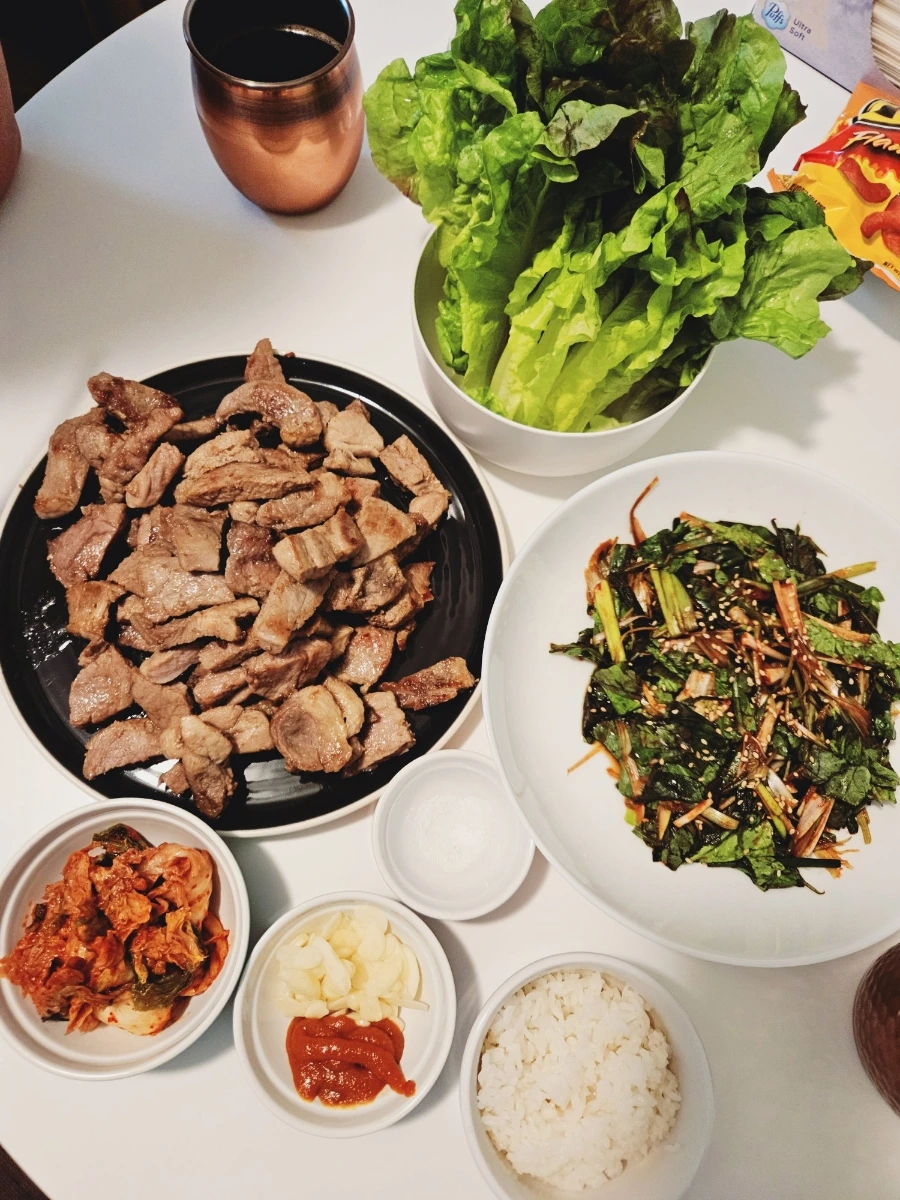 친구 초대해서 우악스럽게 소고기로 원기 보충한 날. 겉절이가 맛있어서 고기가 무한으로 들어갔다. 겉절이가 없으면 느끼해서 얼마 못 먹는데, 매콤달콤 한국식 겉절이와 파채만 있으면 무한대로 흡입 가능하다. 자랑은 아닌데 왜 이리 자랑처럼 늘어놓는지 모르겠다. 모쪼록 유학생에게는 한 번씩 필요한 체력 보강 리추얼이다.