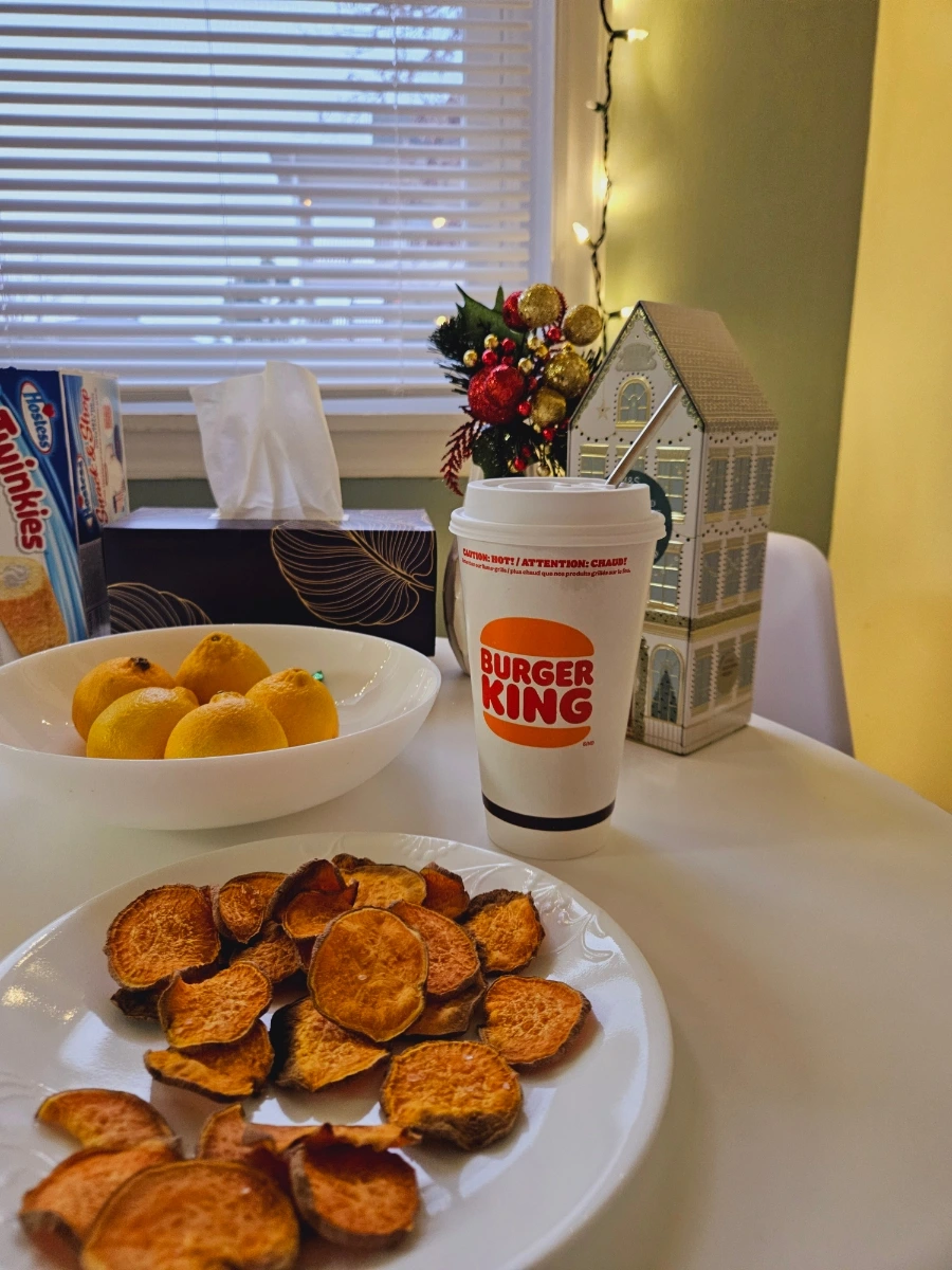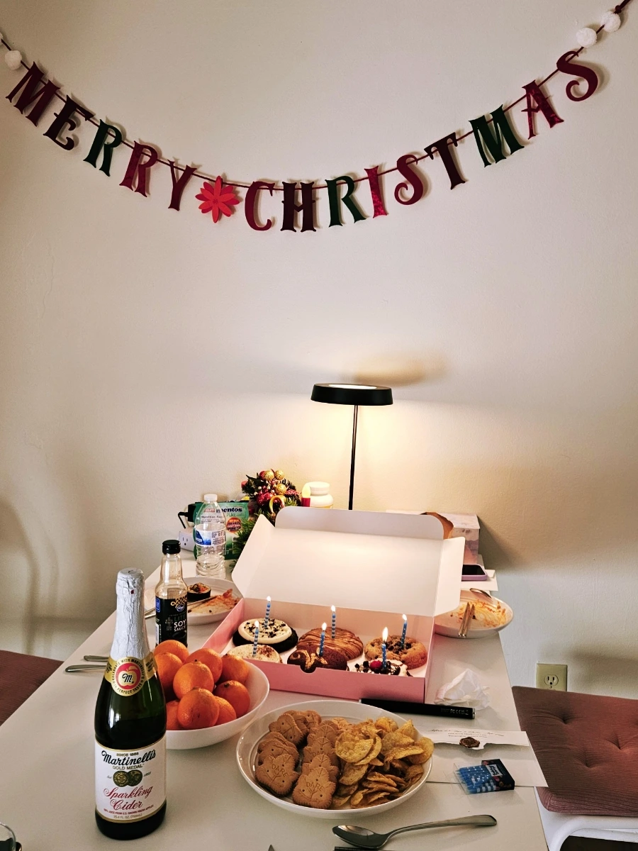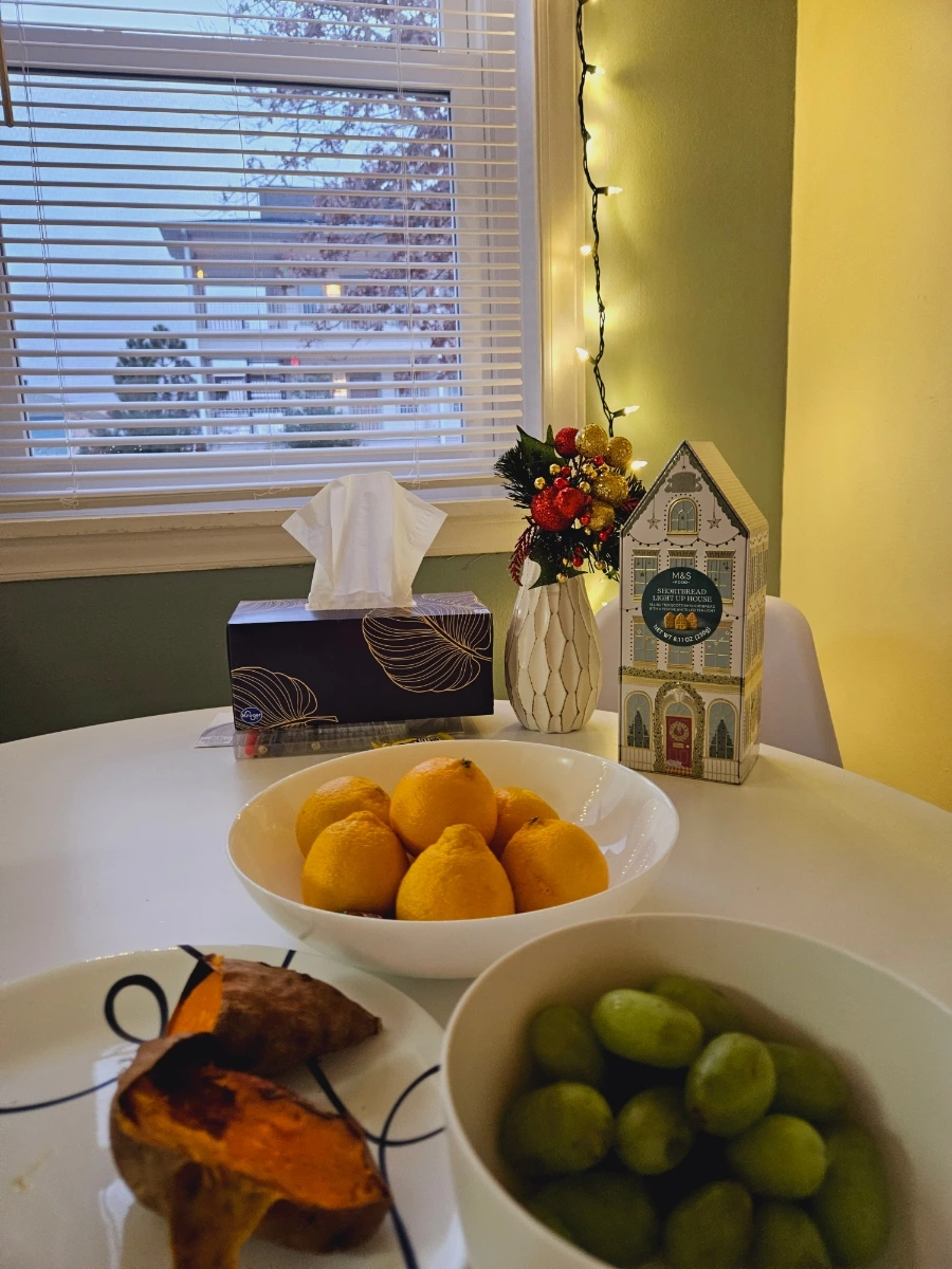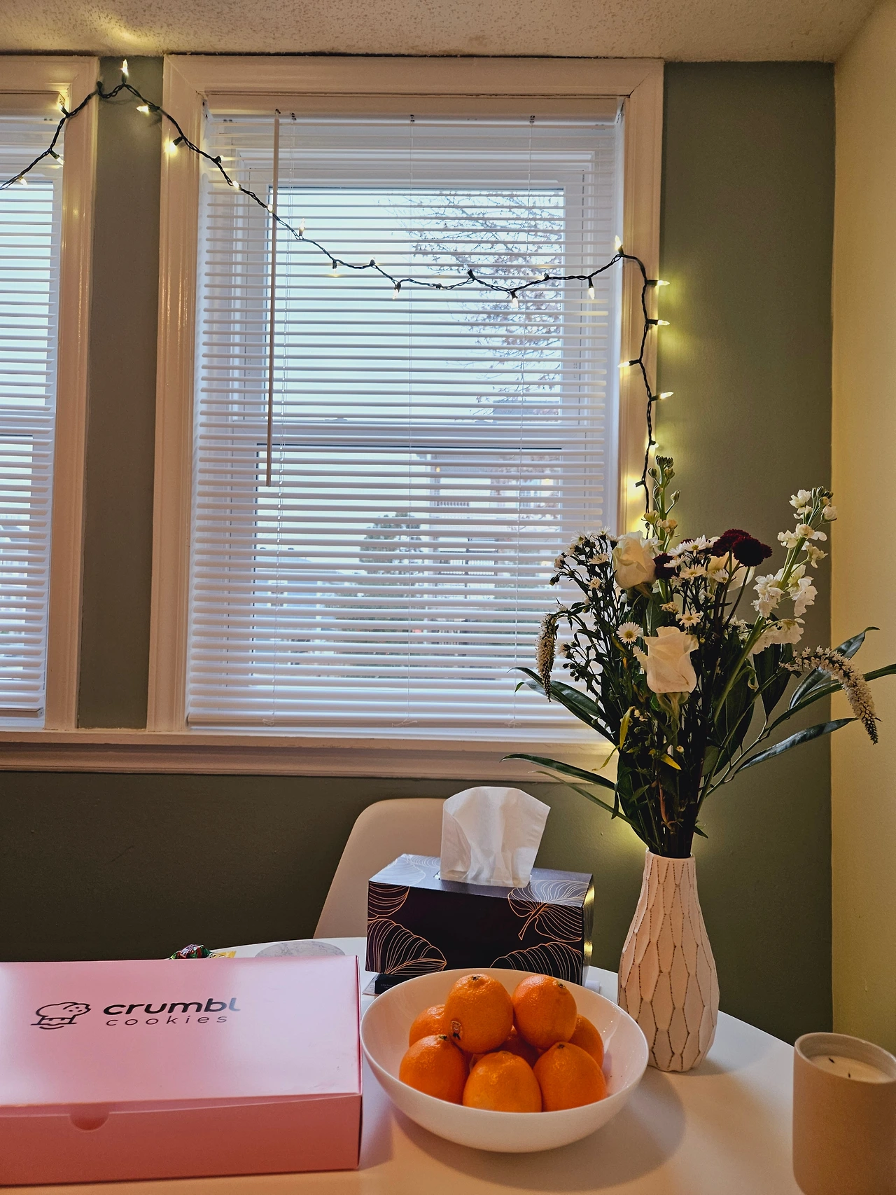 가장 먼저 하게 되는 것은 일단 뒹굴뒹굴이다. 고구마, 귤과 호떡, 이렇게 좋아하는 간식 왕창 사들고 집에서 신나게 먹고 놀았다. 여유가 나자마자 집에 크리스마스 데코레이션을 했다. 만족감이 밀려온다. 여유가 있을 때 집을 꾸미니 즐겁다. 시도 때도 없이 반짝이 전구를 켜고 멍하니 창밖을 내다보며 간식을 느리게 먹는다.