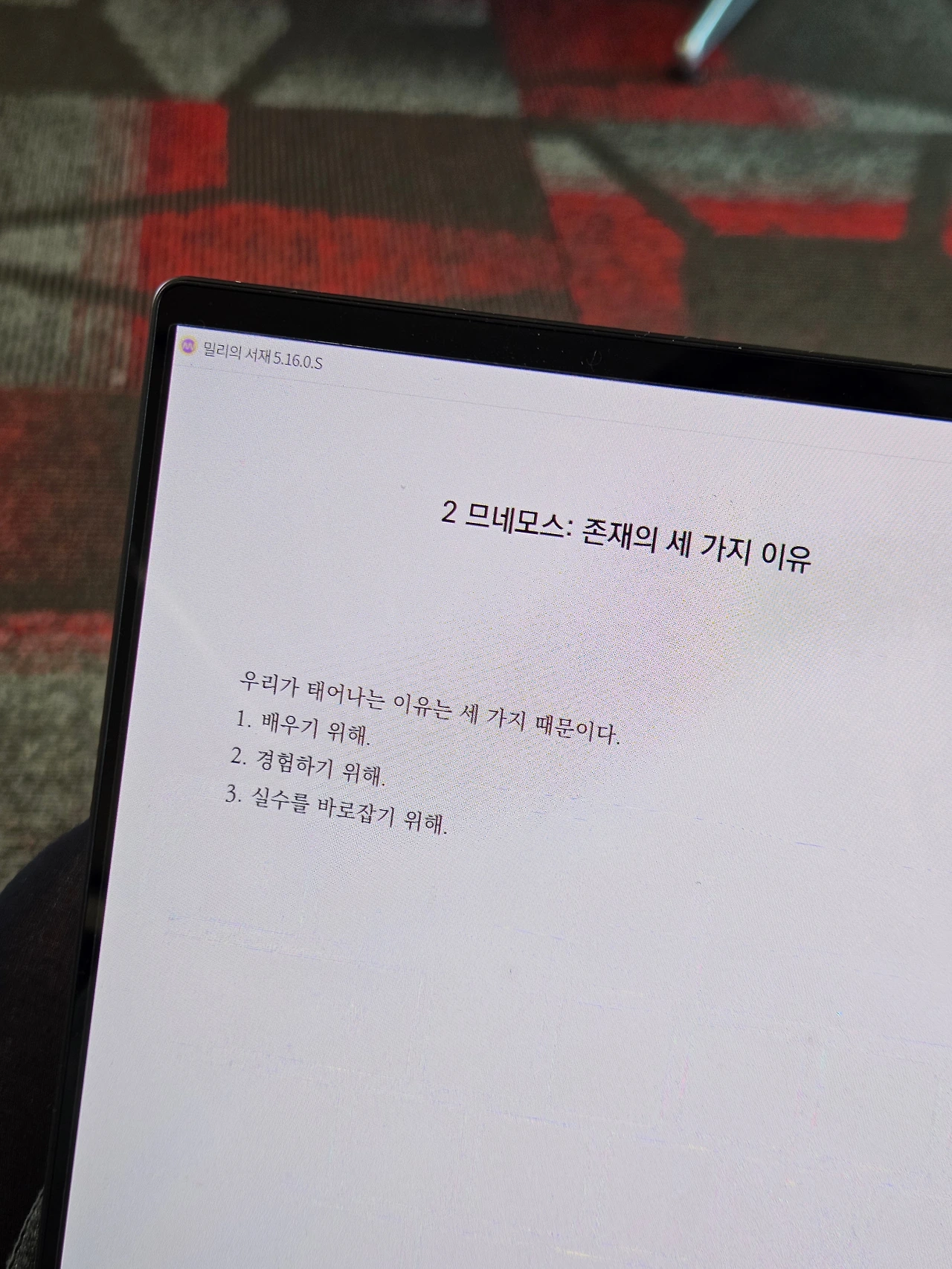 방학과 연휴의 상징 - 밀리의 서재다. 학기 중에는 교과서나 논문 리딩 자료 쳐내고 나면 책은 쳐다보기도 싫어진다. 하여, 여유로움의 상징이 되어버린 밀리의 서재다. 베르나르 베르베르의 신작을 읽고 있는데 너무나 공감되는 한 페이지를 만났다.