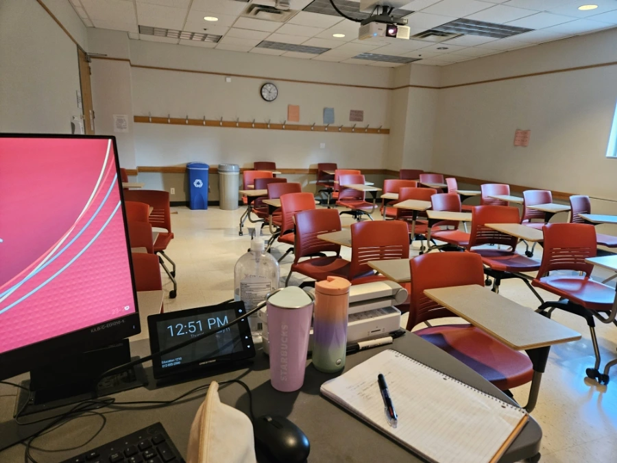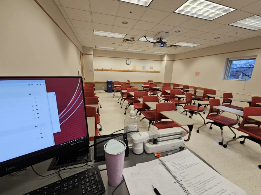 이번 학기부터 대면 수업 티칭 하는 강의실이다. 수업을 마치고 한 컷 남겨보았다. 사진에서도 느껴지는지 모르겠지만, 이 자리에서 오는 부담감과 과 책임감이 꽤나 무겁다. 학생들이 올망졸망 나만 바라보고 있는데, 참 당황스러운 눈길이 아닐 수 없었다. 의지할 곳 없는 철저한 단독 콘서트다, 휴! 아직 언어적으로 자유롭지 못해서 하고 싶은 말이 잘 안 나올 때나, 학생들의 질문을 못 알아들을 때는 너무 수치스럽다.