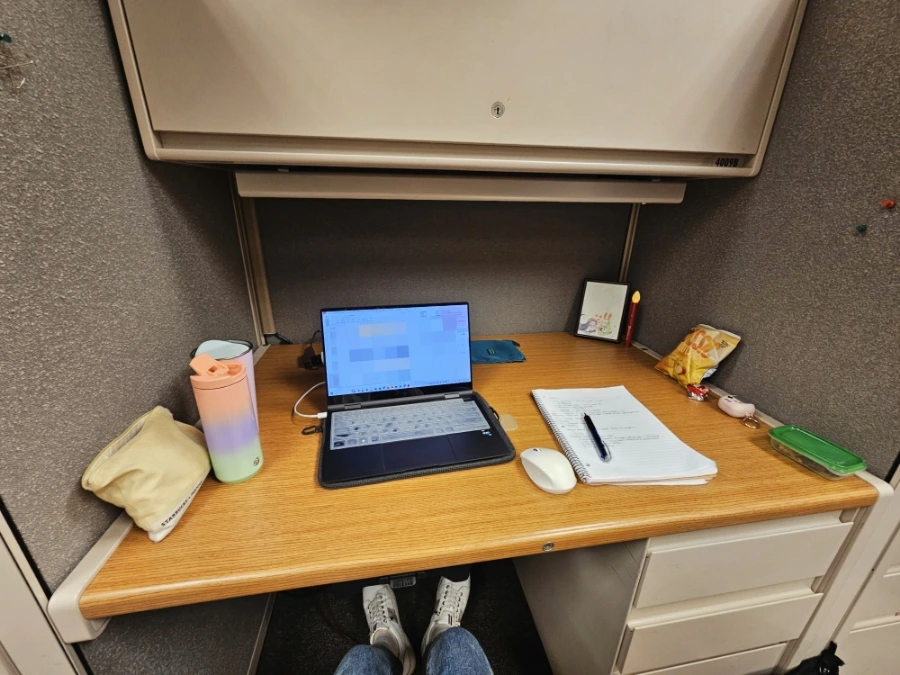 이번 학기 시간표에 파워 공강이 많아서 배정받은 자리를 애용할 전망이다. 양옆으로 교수님들 방이 빼곡히 있고 그 가운데 덩그러니 노출된 채로 이렇게 대학원생들의 책상이 놓여있어 다소 부담스러운 것은 사실이다. 책상 위 뽀얀 먼지를 한번 닦으며 경건한 새 출발 의식을 행해본다.