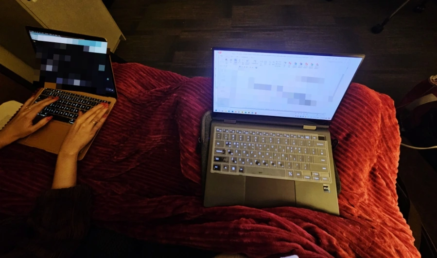 유난히 겨울 같던 봄날, 동기가 전기담요를 가져와서 같이 파묻혀 일했다. 별거 아닌데 이 순간이 왜 이렇게 포근하고 좋던지...... 둘이 아무 말도 없이 타닥타닥 노트북을 치면서 할 것만 했는데도 문득 이 순간이 소중해서 한 컷 남겨보았다. 기록을 남기니 이런 소소함을 돌아볼 수 있어 참 좋다.