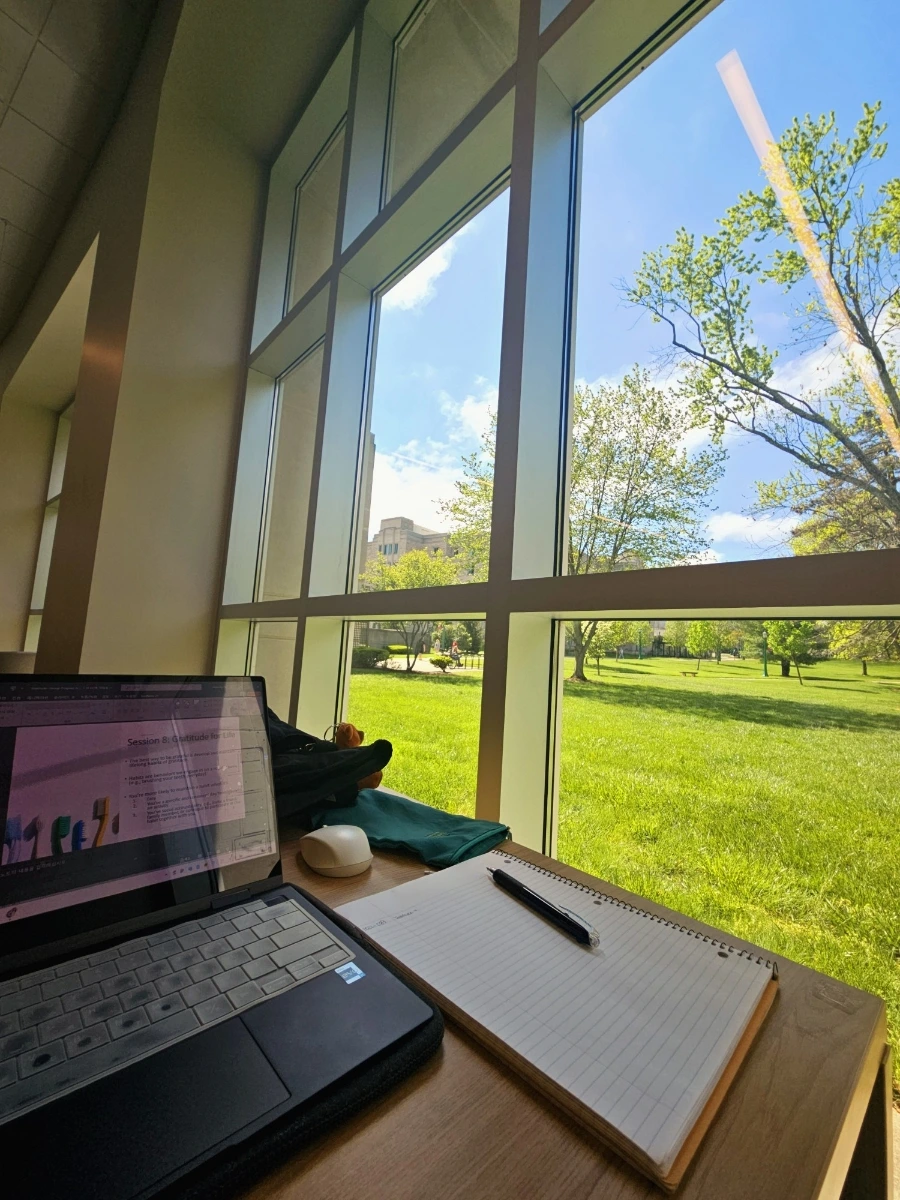 이번 주도 애용했던 도서관이다. 통창이 참 아름답다. 공부하다, 풍경 구경하다를 반복할 수 있어 참 좋은 곳이다. 멍하니 숲을 바라보고 있으면 엄청 힐링이 된다. 공부하기 전에 숲 보면서 좋아하는 노래 한 곡 듣거나, 명상 가이드를 듣는다. 하루 일과 시작 전 많은 격려를 받아 가는 곳이다. 방학에도 생산성을 위해 자주 찾아볼 생각이다.