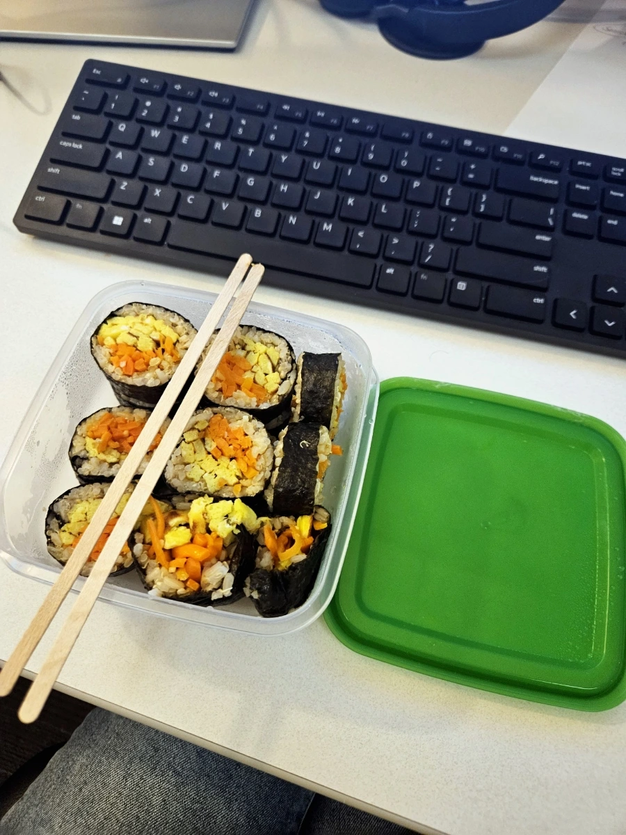 금주의 점심으로 선정하여 주말에 밀프렙으로 왕창 말아두었던 당근 김밥이다. 나리가 당근 라페를 알려줘서 찾아봤더니, 요새 당근 김밥 레시피가 많이 돌아다녔다. 하여, 비슷하게 흉내를 내서 여러 줄을 말아서 점심으로 싸다니며 먹었다. 원래는 당근이 한참 더 많이 들어가야 하는데, 채칼이 없어 하나하나 썰다 보니 인성이 동나서 당근을 얼마 못 썰었다. 그럼에도 맛은 고소하니 희한하게 꽤 괜찮았다. 채칼을 하나 마련해서 제대로 다시 한번 도전해 봐야겠다.