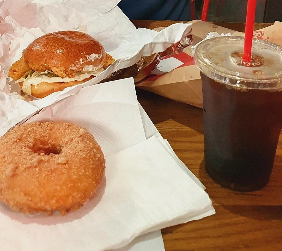 늦게 일어날 것을 알았기에 호텔 조식은 신청해두지 않았다. 숙소 주변에서 아침을 해결할 만한 곳을 찾아보았다. 아침에 달달한 빵과 쌉쌀한 블랙커피를 마시는 것을 좋아한다. 미국의 리치한 도넛을 줄곧 먹어보고 싶었기 때문에 남편과 Do-Rite라는 도넛 가게를 찾았다. 내가 먹은 것은 시나몬 크러스트 도넛이었다. 워낙에 시나몬 덕후라서 + 매대에 이 도넛만 거의 다 팔리고 없어서 두 가지 이유로 시도해 보았는데, 상당히 만족스러웠다. 적당히 달고 기름진 맛. 아침에 가볍게 들러볼 만한 곳이다. 남편의 치킨 샌드위치는 평이했다.