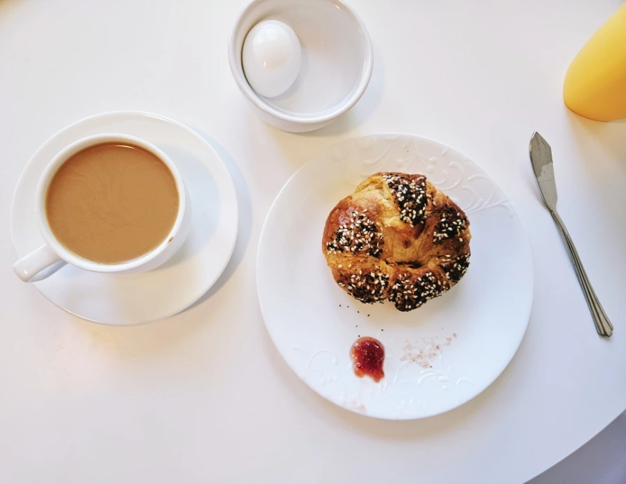 요즘 푹 빠진 크로아상과 반숙 계란, 따뜻한 라테로 먹는 아침이다. 느릿느릿 한 음악도 틀어 둔다. 원래 먹는 것이 되게 느린 편인데, 학기 중에 나갈 채비를 할 때 억지로 서둘러 입속으로 떠미는 식사에 위에 부담이 많이 됐었다. 요새는 재촉할 것 하나 없이 창문 밖을 보면서 세월아 네월아 아침 식사를 먹을 수 있어 좋다. 다 먹고도 자리를 뜨지 않고 한참을 창문 밖을 구경을 하면서 앉아 있는다.