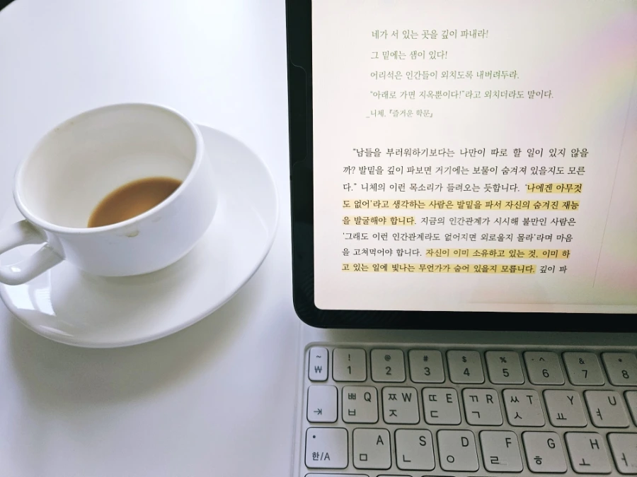편집을 하다가 조금 질리면 밀리의 서재에 들어가 책을 읽으며 정신을 환기시킨다. 요즘 읽는 책은 니체의 자존감 수업과 초역 부처의 말 두 개다. 니체의 자존감 수업은 표지가 너무 예뻐서 자석처럼 이끌렸다. 요즘 책들은 참 감성적이고 예쁘게 나온다. 두 책 다 공통적으로, 스스로에게 되뇌고 싶은 말들이 많이 담겨있어 유익했다. 어찌 보면 '뻔한 말들' 일 수도 있겠지만, 평온하고 맑은 마음 상태에서 읽고 되새기는 문장들은 삶에 꽤나 영향력이 있다. 독서가 스트레스를 낮춰주는 이유가 아닐까 생각해 본다.