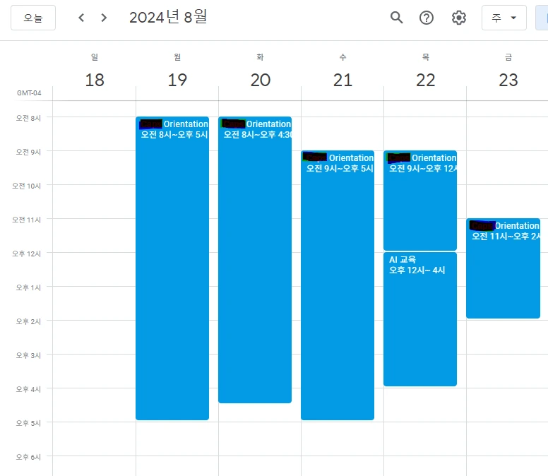 오리엔테이션 일정도 나왔다. 8월 마지막 주가 개강이었는데, 갑자기 그 전주가 되었습니다? 역시나 8시부터 온종일이다. 방학에 늦게 자고 느지막이 일어나는 것이 습관이 되었는데 큰일이다. 오리엔테이션 일정을 받아보니 약간 머릿속에 경종이 울리는 느낌이 들었다. 여름 방학을 세상 게으르게 보내다가 갑자기 오리엔테이션에 가면 교육을 제대로 소화할지 모르겠다.