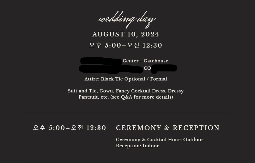 드레스 코드도 지정해 주는데 여러 코드 중 이번 동기의 결혼식은 가장 격식을 차리는 드레스 코드인 Black Tie Optional/Formal이라고 한다. 이런 유의 드레스를 입어본 적이 없어서, Temu에서 20불 대로 저렴하게 하나 구입했다. 미국 결혼식도 한국과 마찬가지로 여자들은 드레스로 신부와 같은 화이트 색상은 피해야 한다. 또, 신부의 Bridesmaids들이 입는 드레스 컬러가 있는데 그것도 피하는 것을 추천한다고 한다. 이것은 절대 겹치면 안 되는 정도까지는 아니나, 되도록 피하는 것을 추천하는 암묵적인 룰 같은 것이라고 한다.