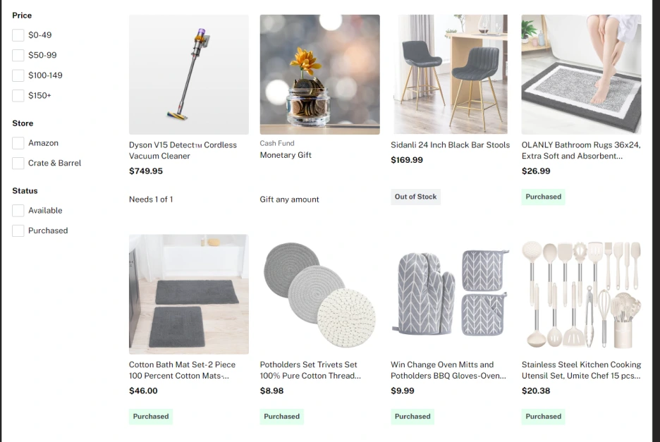 모쪼록 두어 달 전 집 우편으로 청첩장이 왔고, 동기 부부가 생성한 결혼식 사이트에서 참석 여부 설문(RSVP)도 제출했다. 미국은 축의금 대신에 Registry라고 해서, 결혼할 부부가 필요한 리스트를 작성해 두면 초대받은 사람들이 이를 온라인으로 구매해 주도록 되어있다. 위의 사진처럼 다양한 가격대의 물건들이 리스트업 되어있어서 원하는 것을 사주면 된다. 현금 축의나 기프트 카드도 가능하다.