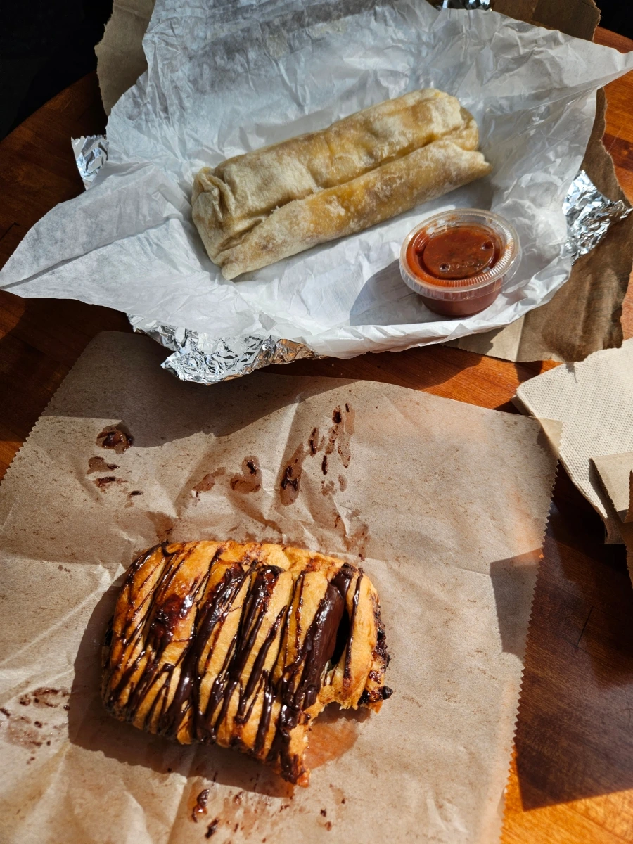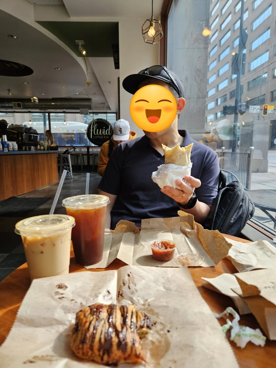 남편은 살사 소스를 찍어 먹는 베이컨 치즈 브리또와 아이스 아메리카노를, 나는 뺑오쇼콜라와 아이스 라테를 시켰다. 커피가 진하고 상당히 맛있었다. 덴버 다운타운에서 가벼운 아침식사와 커피를 찾는다면 추천할만하다.