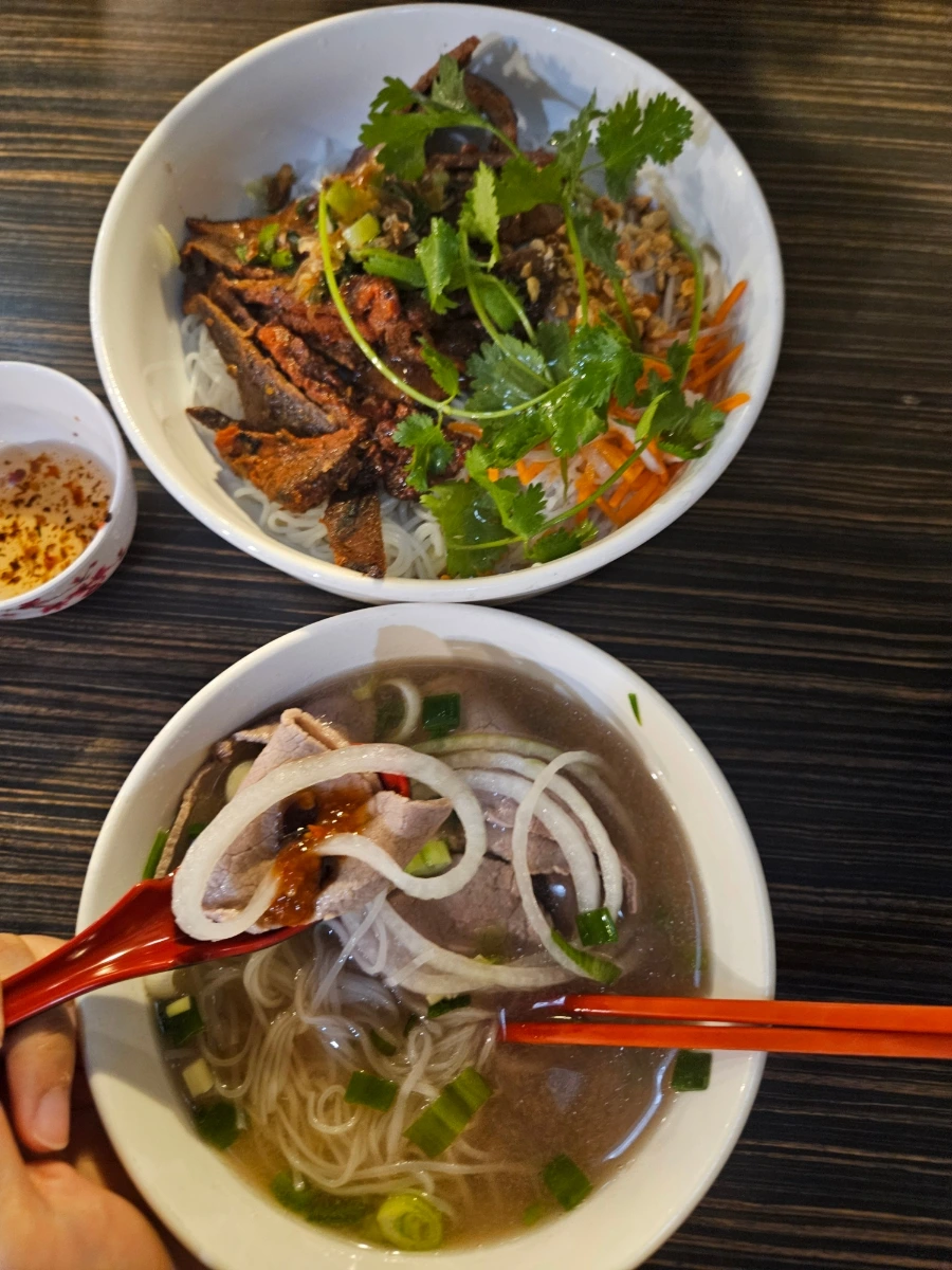 다시 Lyft를 타고 다운타운으로 와서 밥을 먹었다. 가게 이름이 너무 웃긴 베트남 쌀국수 집인데, 맛도 훌륭하다. 양지 쌀국수도 맛있는데 이번에도 그렇듯 남편이 시킨 베트남식 비빔면이 킥이었다. 남편이 시킨 메뉴가 늘 더 맛있는 이유는 무엇일까?