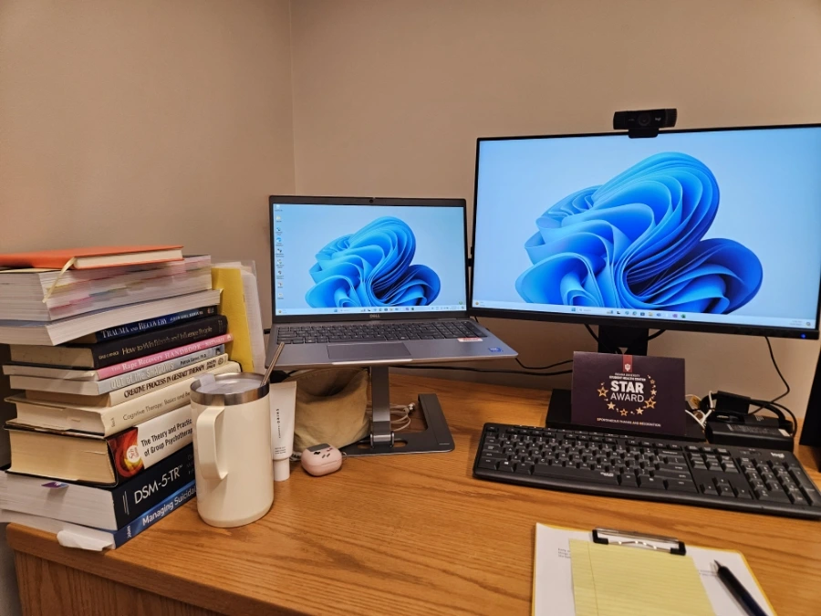 일하는 심리 상담 센터 오피스다. 남편이 노트북 받침대를 사는 것을 보고 잽싸게 같이 하나 사서 설치해 보았다. 센터에서 주는 노트북과 모니터가 높이가 차이가 너무 많이 나서 듀얼 모니터 사용을 못 하고 있었는데, 받침대로 노트북 높이를 높이니 "이거다!" 싶었다. 오피스가 꽤나 만족스러워지고 있다.