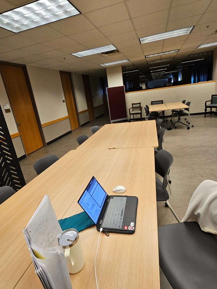 어쩌다 보니 이날도 또 혼자 마지막 퇴근이었다. 이날은 원래 Research Writing Group을 하는 날인데, 같이 하는 친구들이 못 오거나 피곤해서 먼저 가서 혼자 남겨졌다. 요즘 작성 중인 Manuscript을 빨리 진행하고 싶어서 그냥 혼자 남아 마저 하고 갔다. 바로 위 사진을 보면, 내가 일하는 장소 외에는 불도 다 꺼져서 조금 음산하고 무섭긴 하다. 그래도 5시 넘으면 이 공간은 철문이 굳게 닫겨서 열쇠가 있는 관계자만 접근할 수 있다. 그것만 믿고 마저 쭉 하다가 남편과 카풀해서 퇴근했다.