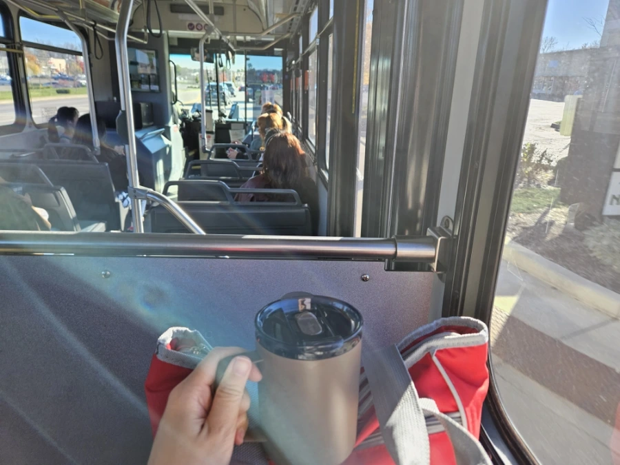 차를 정비소에 맡긴 덕분에 버스를 타고 다녔다. 차에만 의지하고 다녔는데 오랜만에 버스를 타니 나름 그것도 낭만이 있다. 때마침 사진에 볕이 대각선으로 들어 더 감성 있게 나왔다. 서울에서도 그랬는데, 희한하게 버스만 타면 꼭 이 자리에 앉는다. 버스 안 풍경도 한눈에 잘 들어오고, 바깥도 잘 보이고, 뒷문 앞이라 환기도 잘 되는 편이라 어딘가 안정감을 느낀다.