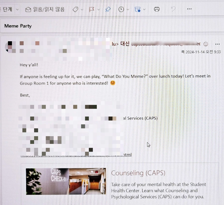 요즘 센터는 수련생뿐만 아니라 선임 스태프 선생님들도 되게 바쁘고, 위기 사례가 많아져서 센터 전반적으로 소진이 심하다고 들었다. 그래서인지 미국 특유의 유머로 한 선임 스태프 선생님이 밈파티 - "왓 아유 밈?"을 연다고 위의 사진처럼 메일이 왔다. 한참을 웃었다. 미국 직장은 참 신기하다. 가끔 이런 것을 볼 때면 tv 시리즈 '오피스'가 눈앞에서 라이브로 펼쳐지는 것만 같다. 늘 새롭고 짜릿하다.
