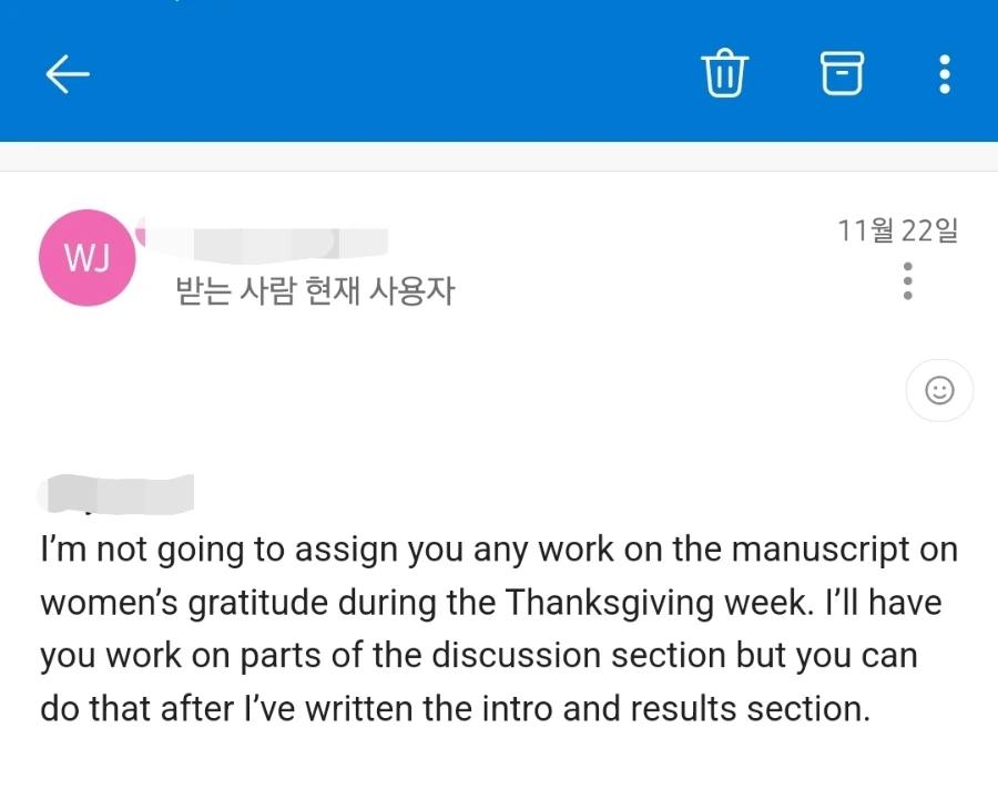 연휴 일주일 풀로 일 빼주는 지도 교수님 실존한다는 썰이다. 최근 지도 교수님 미팅에서 Thanksgiving 연휴에 뭐 할 거냐고 물어보셔서, 그 동안 아프다 뭐다 밀린 일들 천천히 처리해야 할 것 같다고 말씀드렸다. 그날 밤, 이런 이메일이 왔다. 연휴 동안 논문 쓰지 말고 충전하는 시간을 가지라고 하셨다. 연휴 마치고 다시 주겠다며. 뒤에 이번 학기 열 일 했다로 시작해서 구구절절 다정한 말들도 많이 붙여주셨다. 미국에서 제일 운 좋았던 것 중 하나는 지도 교수님 운이었다고 한다. 정말 다정하고 자상한 분이다.