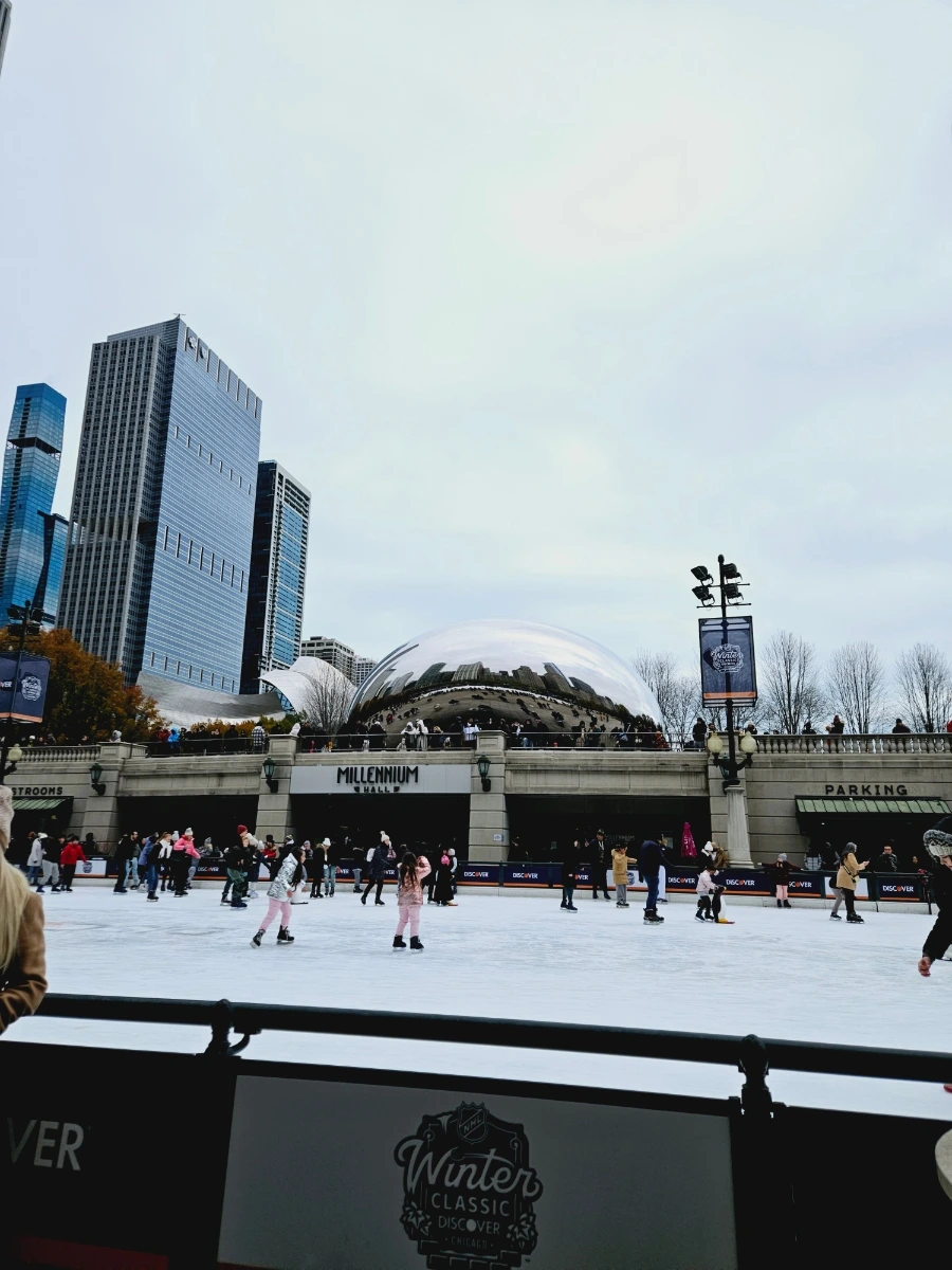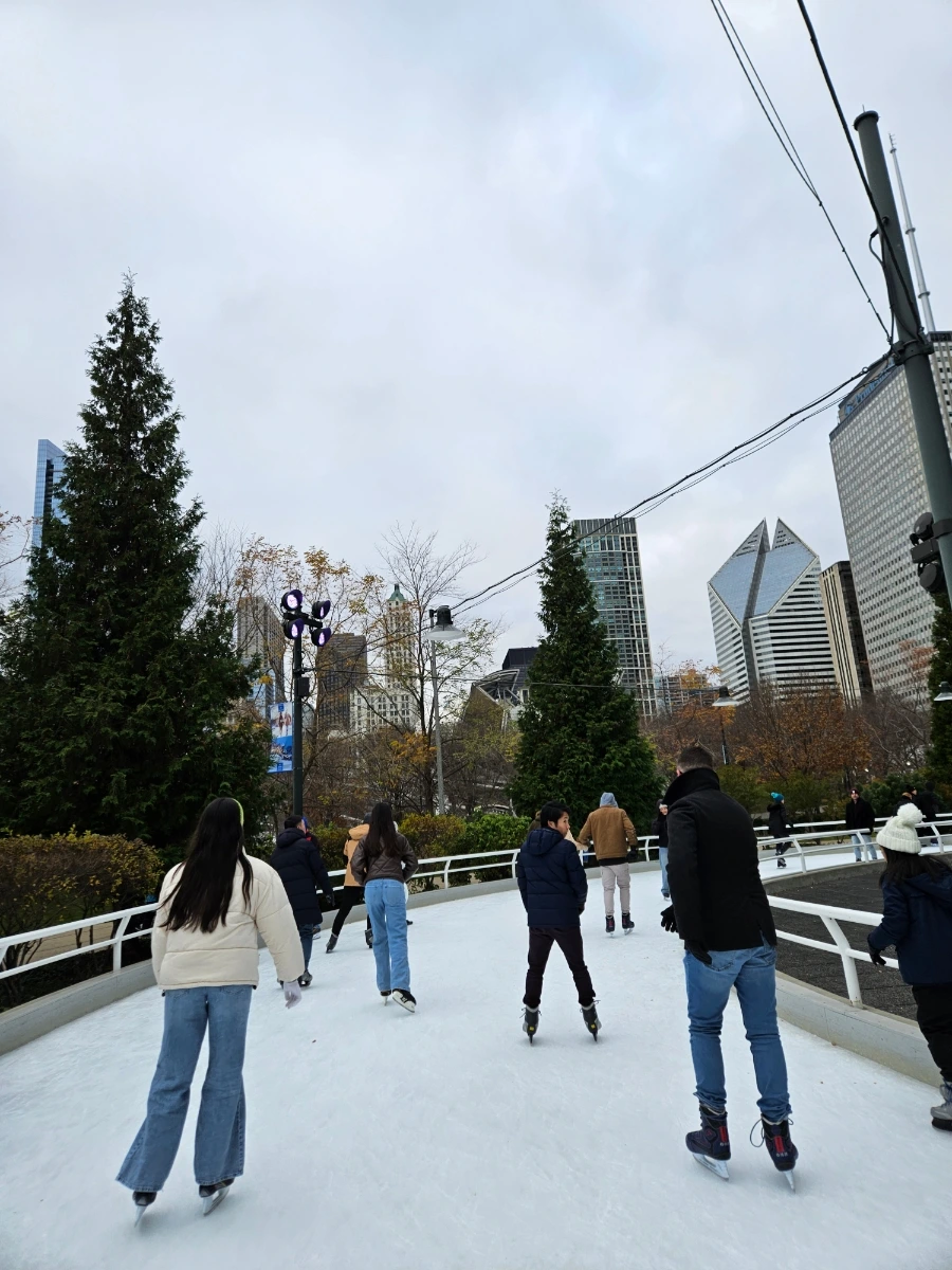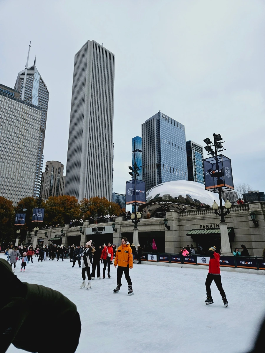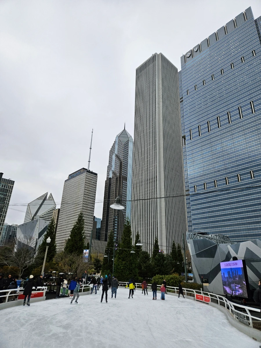 빌딩 숲을 배경으로 느긋하게 얼음을 지치며 링크를 돌았다. 겨울에 스케이트 타는 것을 좋아해서 신났다. 야외라 추울까 걱정했는데, 스케이트장까지 걸어가는 길이 추웠고 막상 스케이트를 타니 몸에 열이 나서 괜찮았다. 그렇지만 시카고가 Windy City라고 불리는 만큼, 바람이 불기 시작하면 사정없이 추워지니 기본적인 중무장은 필수다. 귀나 얼굴이 정말 시리다. 그래도 스케이트장 입구 바로 옆에 핫 초콜릿과 커피, 차를 팔고 있어서 몸을 녹이기도 용이하다. 다만, 100% 야외 시설이다 보니 갈아 신는 벤치에 온열기라도 있기를 바랐는데 일절 없어서 조금 아쉬웠다.
