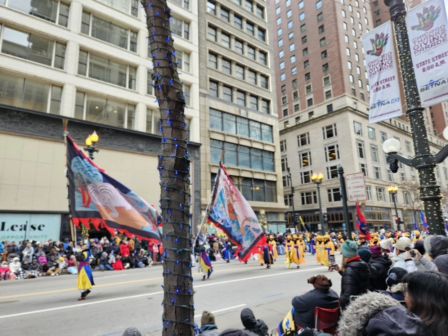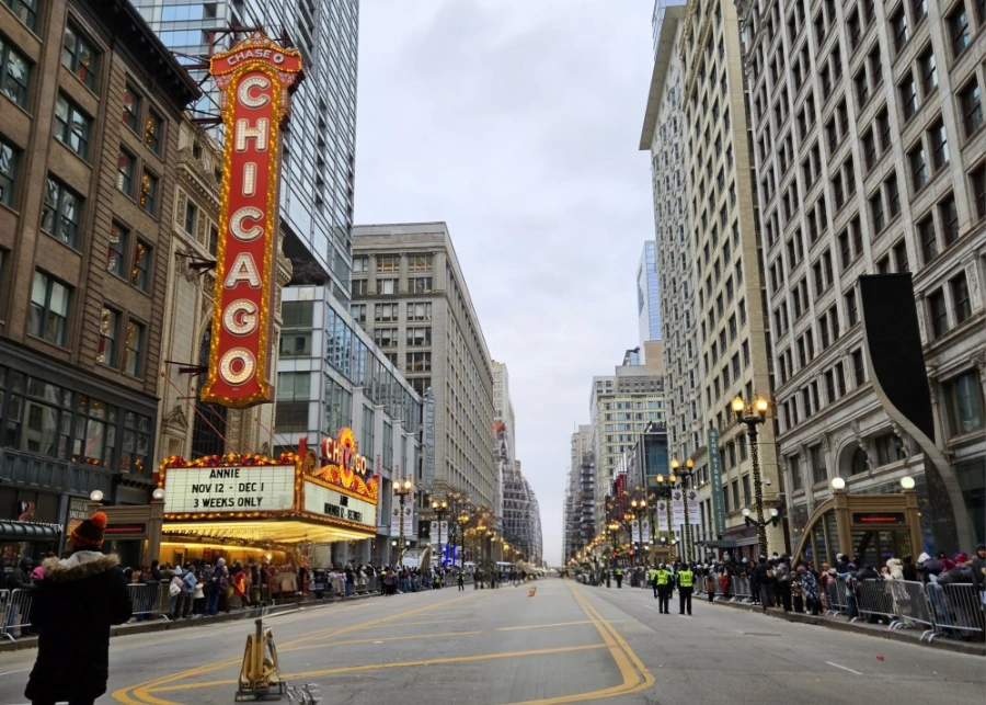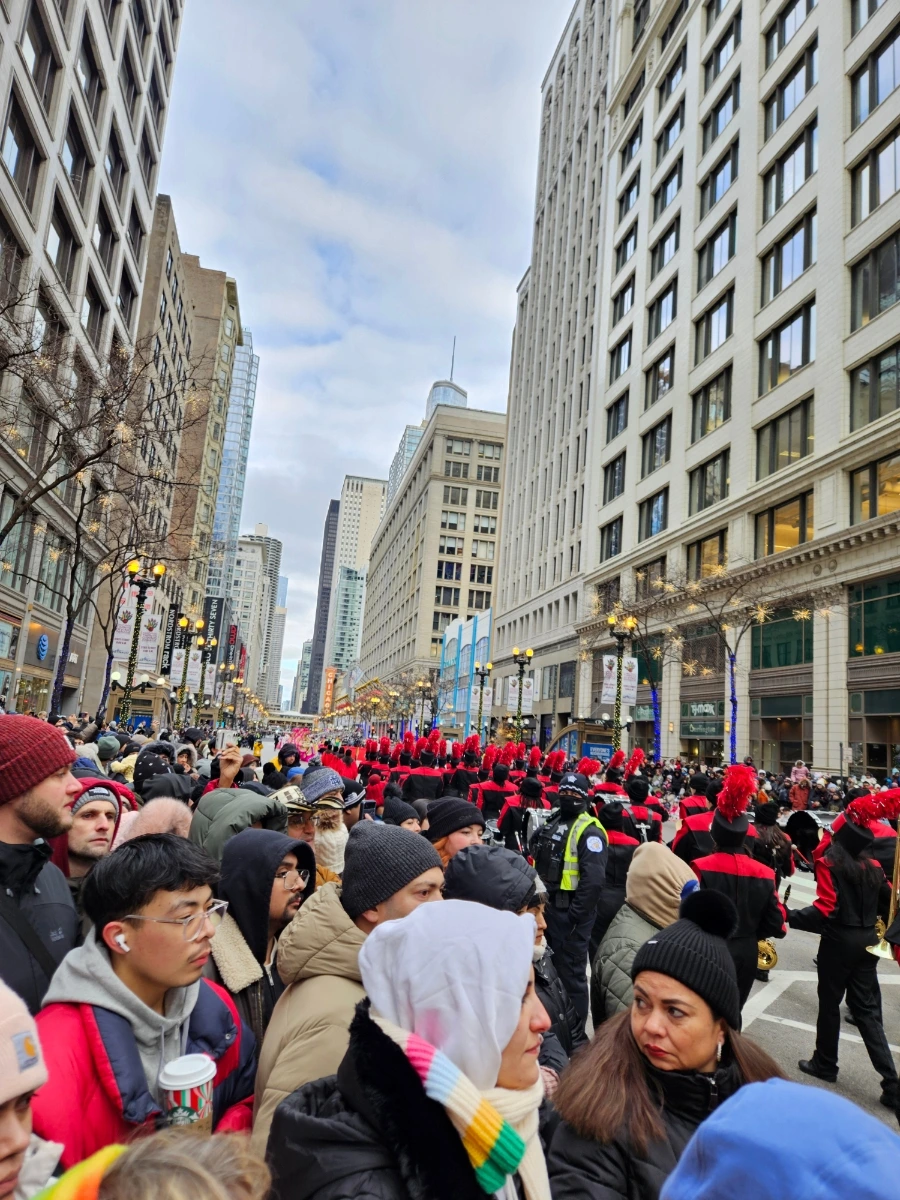 시카고의 전통적인 상징물 중 하나인 시카고 극장 앞 대로변이다. 이 대로를 몇 블록을 전면 통제하고 퍼레이드를 준비 중이었다. 위의 사진처럼 대로를 온통 다 비워놓고, 구경하는 사람들은 양옆 인도로 통제시킨 후 퍼레이드를 진행하였다. 날이 0도 정도 기온인지라, 롱패딩과 목도리, 장갑, 기모 내복 등을 꼭꼭 잘 껴입고 나갔다.