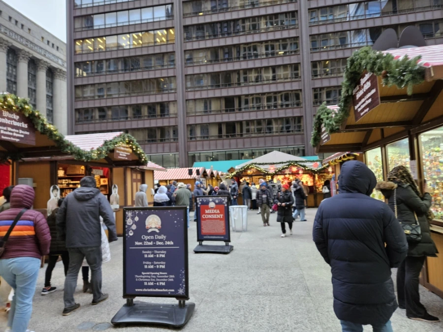 유럽의 글리 봐 인과 시나몬롤, 프레첼과 수공예품을 파는 동시에, 미국의 핫도그, 애플 사이다, 햄버거도 찾아볼 수 있는 시카고의 크리스마스 마켓이다. 빌딩 숲 사이에 위치한 마켓이 유럽의 크리스마스 마켓과는 또 다른 느낌을 자아낸다. 대부분의 가게들이 현금만 받으므로 입구에 있는 현금인출기에서 달러를 인출해서 구매를 해야 한다.