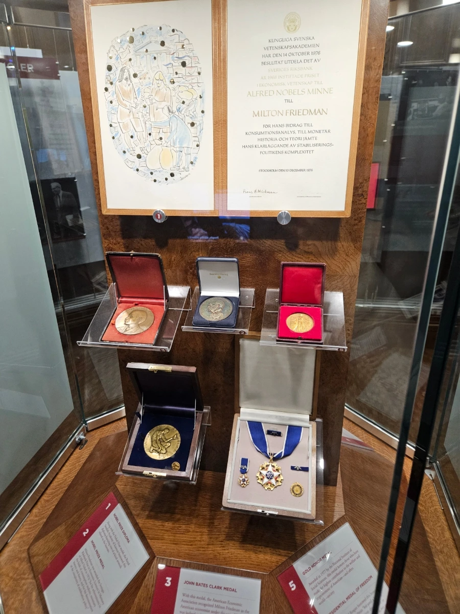 남편이 고대하던 시카고 대학 경제학과 건물을 찾아 구경해 보았다. 역시나 외관상으로는 꽤 오래되어 보이는 클래식한 건물이었다. 들어가자마자 건물 1층에 노벨 경제학상을 비롯해 해당 학과의 경제학자들이 휩쓸어온 상들을 진열해둔 자그마한 특별 기념관이 가장 먼저 시야에 들어왔다. 위의 메달이 노벨경제학상이라고 한다. 노벨상을 배출한 학교의 자부심이 느껴졌다.