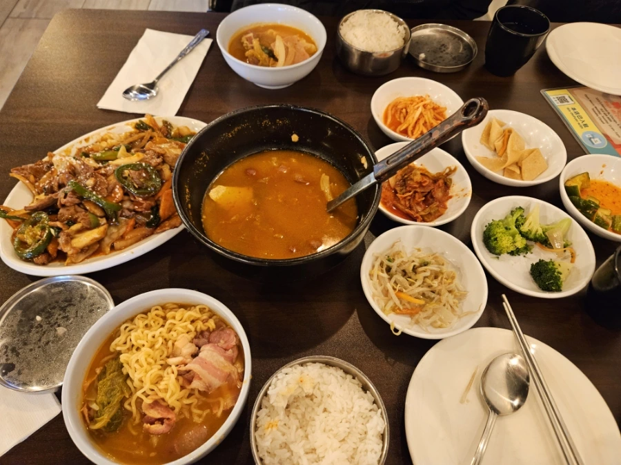 남의 떡을 실컷 구경하고 나와서는 학교로부터 10분 거리에 있는 한식집을 찾아왔다. 날씨가 쌀쌀해서 국물이 거하게 끌렸다. 부대찌개와 제육볶음을 시켜서 정신없이 먹었다. 너무 배고팠던 나머지, 몇 입 먹어버리고 사진을 찍은 것은 함정이다. 한식집은 블루밍턴에서 접할 수 있는 여느 한식집의 맛과 크게 다르지 않았다. 뭐랄까, 특유의 미국물을 살짝 바른 한식 맛이랄까? 제육볶음에 청양고추 대신 할라피뇨가 들어있는, 미묘하지만 지대한 차이랄까? 고춧가루에 맵칼함이 잘 없는 맛이랄까.