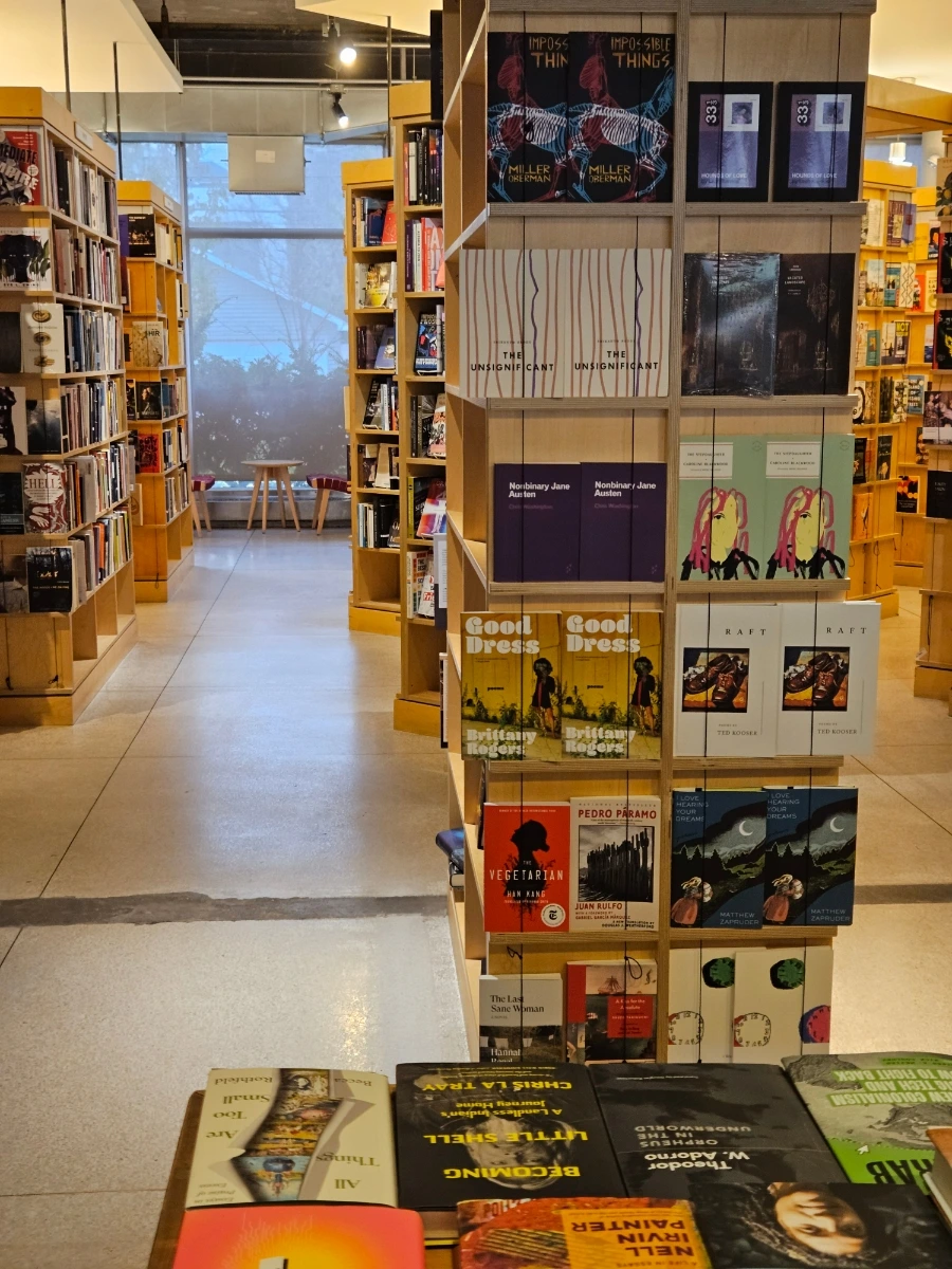 학내 서점에도 들어가 보았다. 자랑스러운 한강 작가의 채식주의자 영어 번역본이 벽에 떡하니 자리하고 있어 뿌듯했다. 얼마 전 동네 책방에서도 채식주의자 책이 베스트셀러 코너에 디피되어 있는 것을 보고, 연달아 이곳에서 두 번째로 본다. 이곳은 전공서적 이외의 대중서도 그 주제가 다양하게 많고, 고즈넉한 서점 분위기가 너무 좋았다. 어디 나다니기 추운 겨울, 주말 한낮에 따뜻한 커피 한 잔 들고 와서 책들 사이를 기웃거리기 좋겠다.