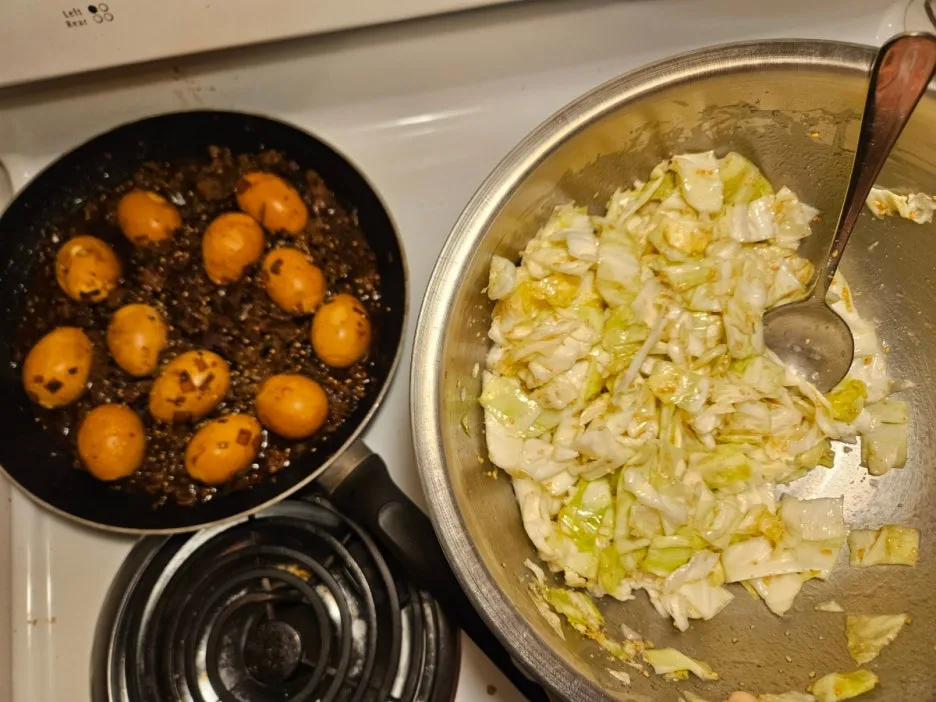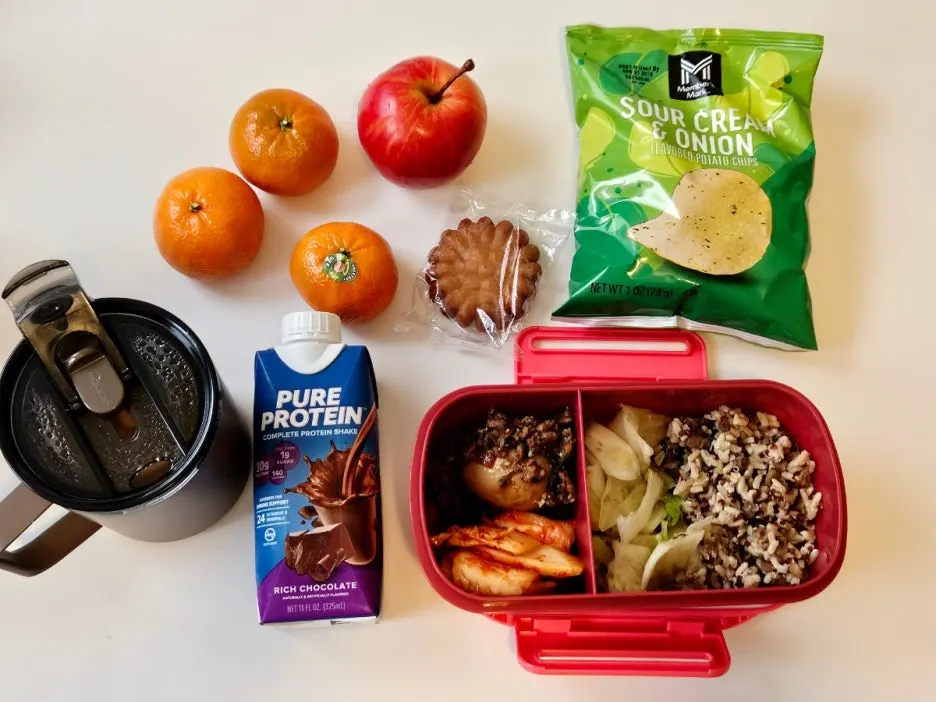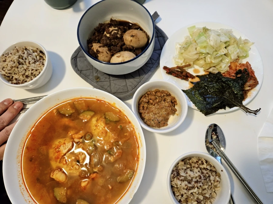 금주의 밀프렙 되시겠다. 소고기 계란장조림과 들기름 양배추 무침이다. 일요일 밤에 왕창 만들어 놓고 점심 도시락에도 싸가고, 퇴근하고 와서는 저녁으로도 먹었다. 둘 다 잘 물리지 않는 대표적인 K-집 반찬 느낌이라 무난히 한 주 내내 잘 먹었다. 질림을 조기에 방지하기 위해서 저녁밥에는 찌개 하나 끓이고 다른 밑반찬을 곁들여 냈다. 도시락은 더 간단하게 잡곡밥 위에 들기름 양배추 무침을 올리고, 장조림과 김치, 마늘쫑을 반찬으로 싸갔다. 늦어질 점심을 대비해 프로틴 셰이크와 과일, 약과와 감자칩도 준비했다.