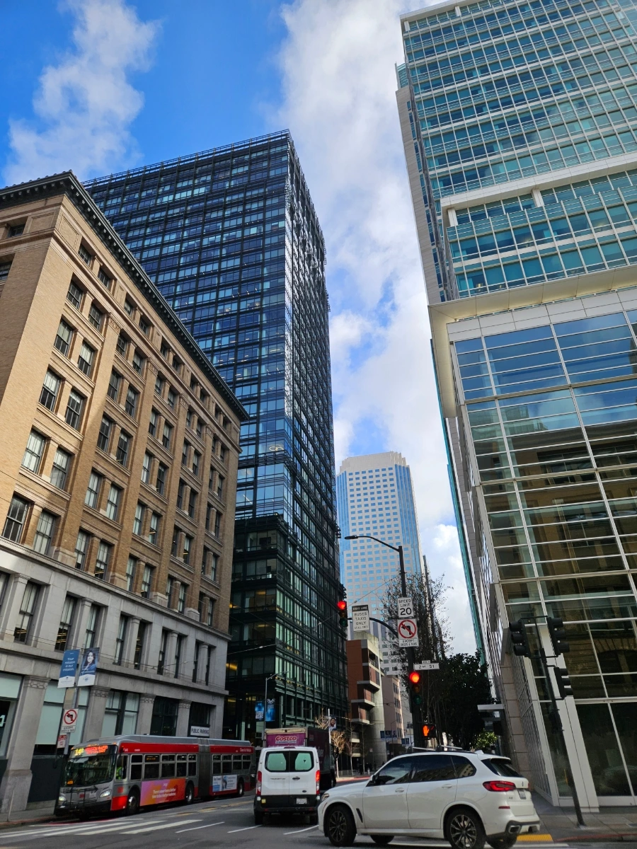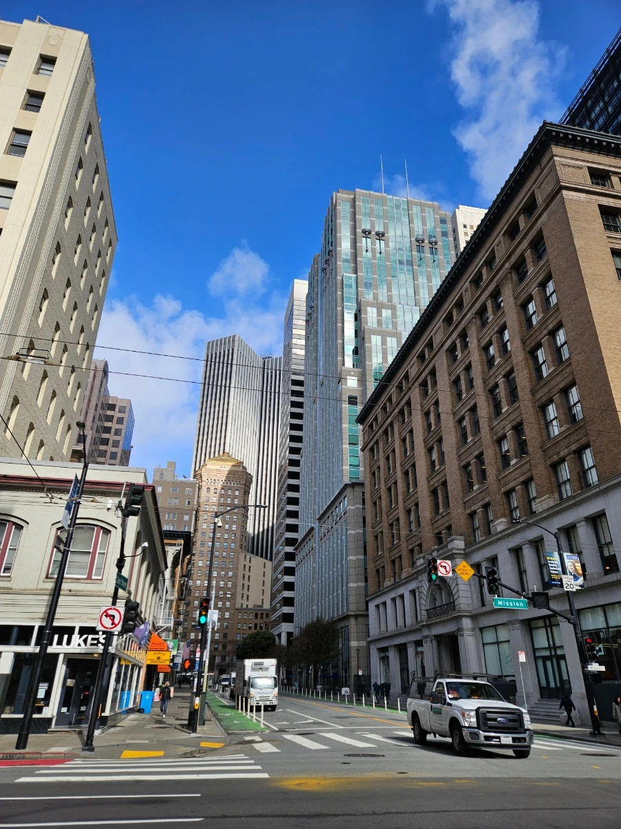 새벽같이 도착해서, 언니네 집에 짐을 내리고는 제일 먼저 빌딩 숲 사이를 누벼보았다. 팬시한 도시의 느낌이 오랜만이라 꽤 기분이 좋았다. 게다가 평일 오전인지라, 빌딩 숲 사이사이 사람들도 많았고 꽤 생동감 있었다. 트램과 대중교통들, 전기차들이 가득한 거리를 보아하니 샌프란시스코에 오긴 왔구나 싶었다.