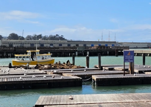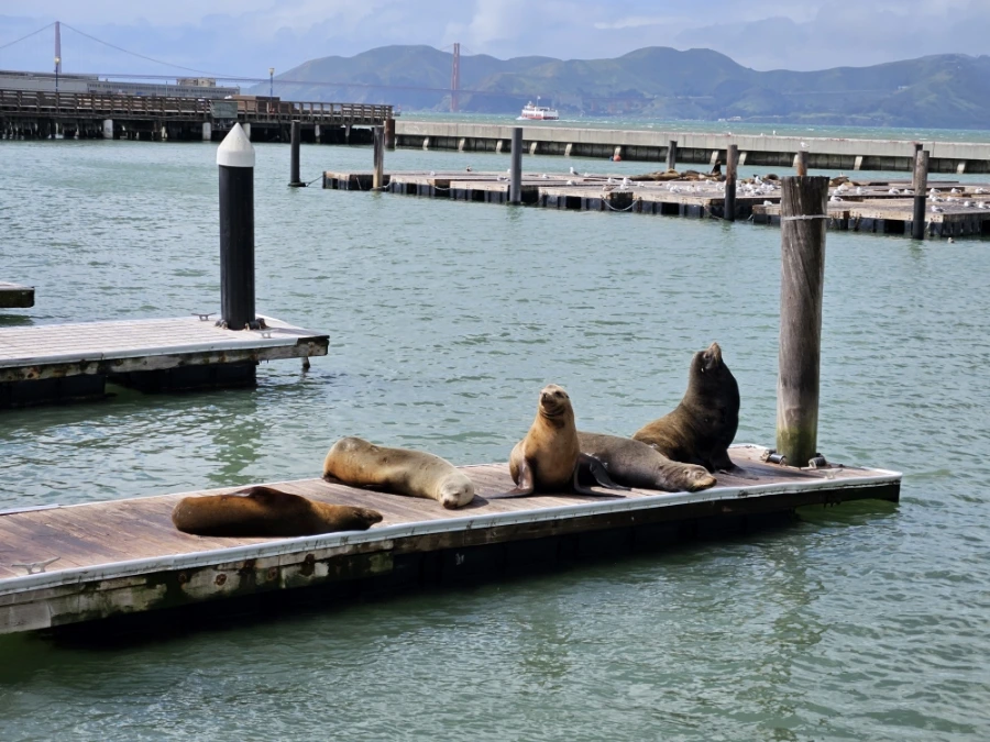 배를 따스히 채우고 조금 걸으니 그 유명한 피어 39 바다사자들이 쪼르르 일광욕 중이었다. 원래는 저 갑판을 가득 채울 만큼 많은데, 아쉽게도 직전에 비가 와서 별로 나와있지 않다고 했다. 그래도 살면서 동물원 아닌 곳에서 바다사자를 이렇게 가까이서 본 적은 처음이라 귀엽고 신기했다. 원래는 냄새(?)도 많이 난다고 하는데 비가 온 직후라 그런지 별다른 냄새는 나지 않았다고 한다.