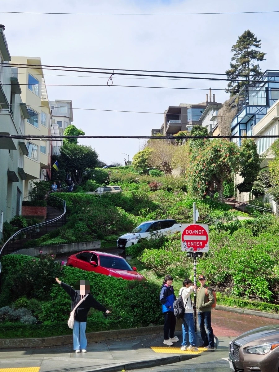 샌프란시스코의 상징 중 하나인 롬바드 스트리트다. 도심에서 케이블카를 타다가 내려 가파른- 많이 가파른- 언덕을 5분 정도 걸어 오르면 짠하고 나타난다. 듣던 대로 지그재그 모양으로 난 길을 차들이 천천히 내려오고 있는 모습이다. 구글맵 사진에서 꽃이 만개한 모습을 많이 봐서 그런지 막상 도착했는데 꽃이 없어서 살짝 아쉬웠다. 조금 더 화려한 모습을 기대했나 보다.