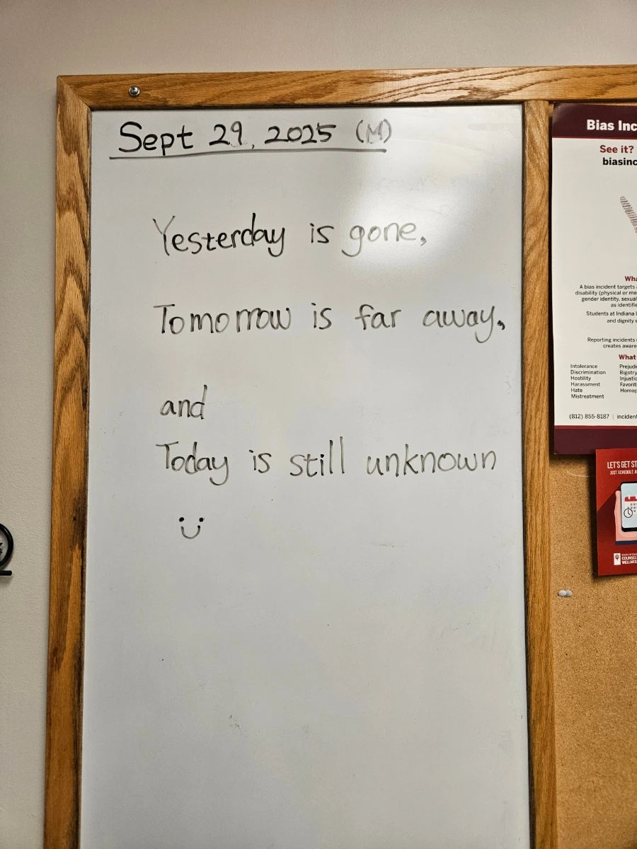그리고 하나의 문화로 자리 잡은 공유 키친 화이트보드다. 금요일 일과 마친 후, 다가올 월요일을 대비해서 나도 하나 끄적여 보았다. 최근에 제일 인상 깊게 본 넷플릭스 '미지의 서울'에 나온 대사를 챗 지피티한테 번역해달라고 한 것이다. '어제는 끝났고, 내일은 멀었고, 오늘은 아직 모른다'는 대사다. 어쩐지 월요일을 시작하는 마당에 보면 좋을 것 같아서 하나 적어놓고 나왔다.