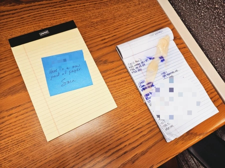한 행정 직원은 내 책상에 새로운 노트패드 하나를 대체하고 쪽지를 남겨 주었다. 테러 당한 노트는 경찰 조사까지 증거 제출용으로 일단 보관하고 있었는데, 네임택을 떼러 와서 이 증거물을 보고는 마음이 안 좋았던 모양이다. 별것 아니지만 고마웠다. 또 다른 교수님 한 분은 뭐든 위로를 표현해 주고 싶은데 도난당한 물건을 자기가 사줘도 되겠냐고 엄청 조심스럽게 물어봐 주셨다. 여러모로 너무너무 화가 났었는데, 이런 대처 덕분에 그래도 한결 마음이 누그러졌다.