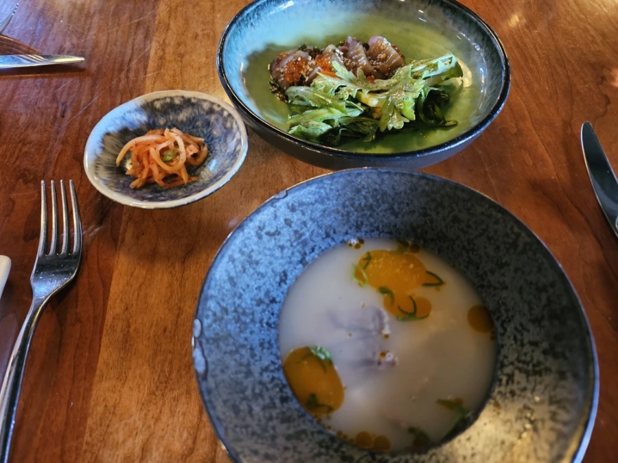 애피타이저로 나온 설렁탕과 가자미회 도토리묵 무침이다. 둘 중 선택하게 되어 있었는데, 남편과 하나씩 시켜서 둘 다 맛보았다. 둘 다 재미있는 맛이었다. 설렁탕은 소고기와 무가 들어있는데, 희한하게도 딱 설렁탕에 깍두기 부어먹는 그 맛이 났다. 무가 아삭아삭하고 새콤하니 딱 그 느낌이었다. 밥도 들어있어서 숟가락으로 후루룩 먹게 된다. 다만 아쉬웠던 것은 온도와 양이었다. 우리가 아는 국밥의 뜨끈함에 한참 못 미치는 미온적인 온도였고, 양도 확실히 적어서 다섯 숟가락 컷이라 먹다만 느낌에 많이 아쉬웠다.