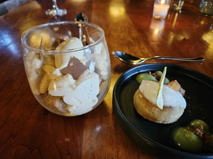 마지막 디저트 섹션은 메뉴 3개 중 택일하게 되어있는데, 남편은 버번이 들어간 시그니처 디저트를 (왼쪽), 나는 애플 소스가 들어간 케이크를 주문했다. 케이크는 다소 평이했고, 왼쪽 디저트가 특이하고 맛있었다. 한국에서 쓰는 '향' 연기를 뚜껑에 가둔 채로 나와서 개봉해서 먹는 것인데, 희한하게 그 향의 향이 잘 어울리고 퐁신한 시트와 촉촉하고 넉넉한 크림이 리치하고 맛있었다. 코스마다 조금씩 나오던 음식량에 비해 디저트 양이 제일 풍족한 것 같다. 모쪼록 디저트까지 맛있게 먹은 코스였다.