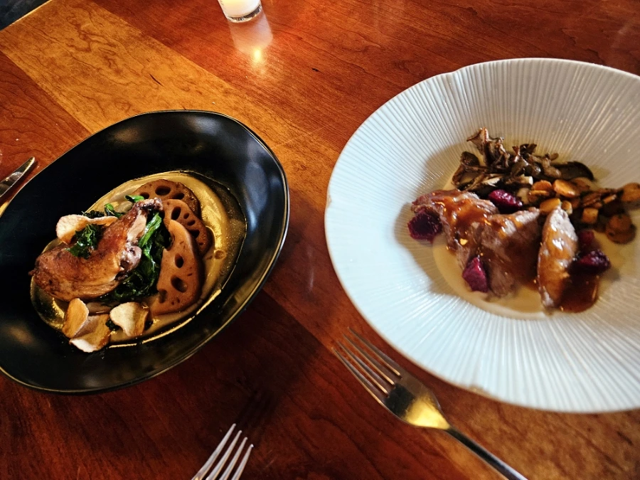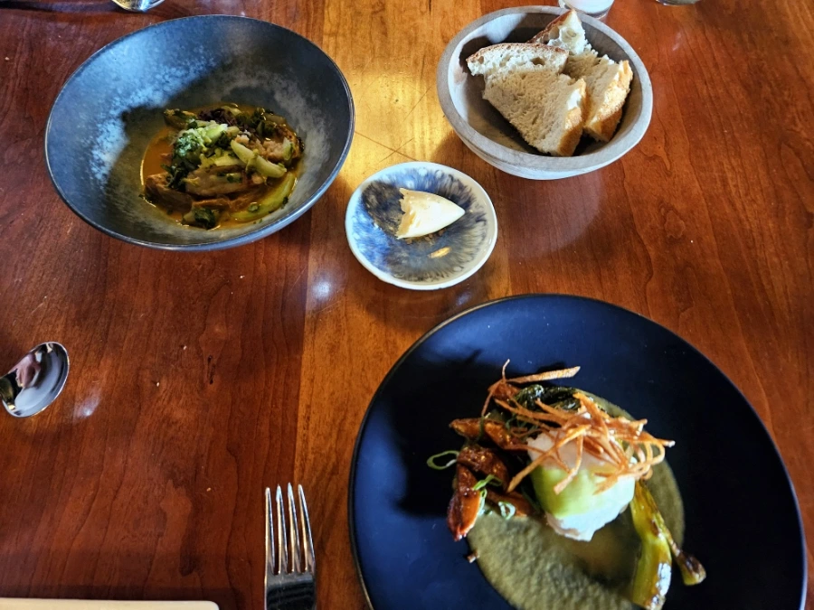 그다음은 해산물 코너였다. 역시 남편과 다른 옵션으로 주문했던 섹션이다. 통통한 아귀살이 초록색 칠리빈 소스와 함께 나온 디시와, 게가 들어간 똠얌꿍 비스름한 맛이 나는 스튜 요리였다. 해산물 섹션은 둘 다 먹어보지 못한 새로운 맛이라 기대 이상이었다. 다채로운 재료들이 들어가서 이제껏 먹어보지 못한 맛을 낸다. 이것이 파인 다이닝의 묘미일까.