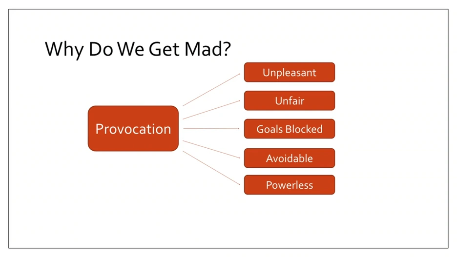 분노 유발 자극(provocation)이 주어질 때 분노를 경험하게 된다. 자극은 수도 없이 다양하지만 5가지 카테고리로 분류할 수 있다. 불쾌할 때(Unpleasant), 불공평할 때(Unfair), 가로막힐 때(Goals Blocked), 회피할 수 있을 때(Avoidable-이건 무슨 의미인지 아직 잘 모르겠다-), 무력하다고 느낄 때(Powerless)가 그 다섯 가지다. 그렇지만 이런 자극이 주어진다고 항상 화가 나는 것은 아니다.