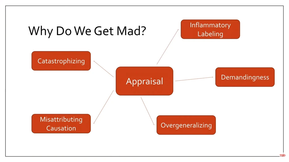 특히 해석 단계에서 위와 같은 다섯 가지 부류의 사고 유형(인지왜곡)을 보일 때, 더 크고 잦은 분노를 경험하게 한다. 현재 상황을 더 파국적으로 생각하는 재앙화(Catastrophizing), 차 키가 안 보일 때 제 발로 없어졌다며 열쇠에 화를 내는 등의 오귀인(Misattributing Causation), 항상 빨간불에만 걸린다는 과잉 일반화(Overgeneralizing), 나의 요구를 타인의 것보다 항상 우선시하는 경향성(Demandingness), '머저리, 멍청이들' 등의 자극적인 단어를 붙이는 것(Inflammatory Labeling). 이러한 유형의 사고와 행동들이 분노를 더 점화한다.