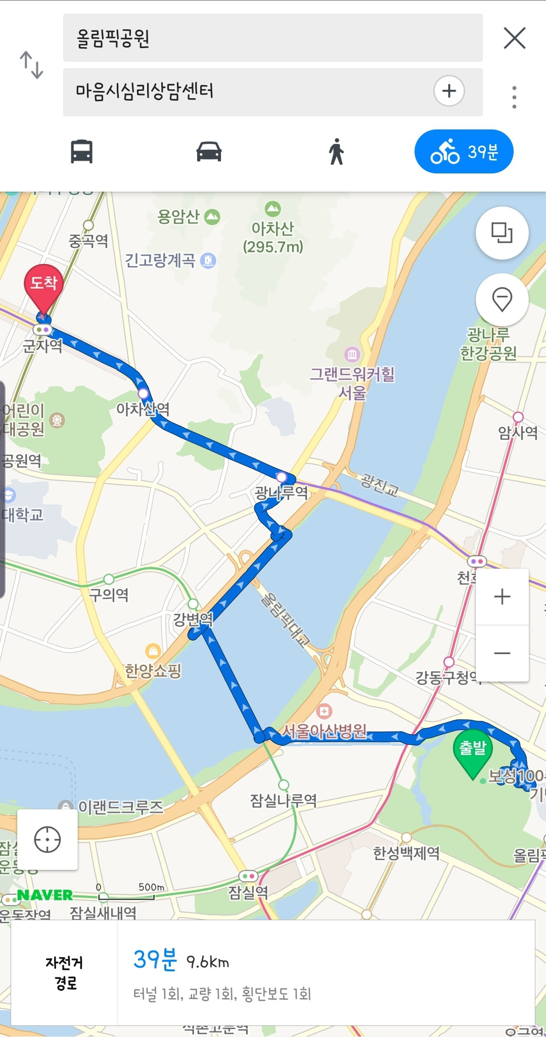 해서, 좀 먼데로 나가고 싶은 마음에 자전거로 저녁 출근을 하기로 급 마음을 먹었다. 출발지는 올림픽공원, 도착지는 광진구 군자역에 있는 마음시 심리상담센터. 밑도 끝도 없는 자전거 여행을 시작했다. 한 평생 늘 그랬듯, 이 날도 아무 계획 없이 시작된 일이었다. 역시 삶은 계획하는 것이 아니라 흘러가는 것이 제 맛이다. 어쩌면 해야될 것에 옭죄이지 않고 그냥 하고 싶은대로 좀 하고 싶었는지도 모르겠다.