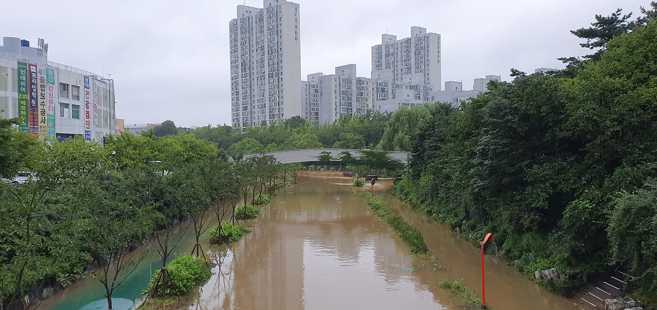 거의 장마기간 내내 범람해 있던 동네천.