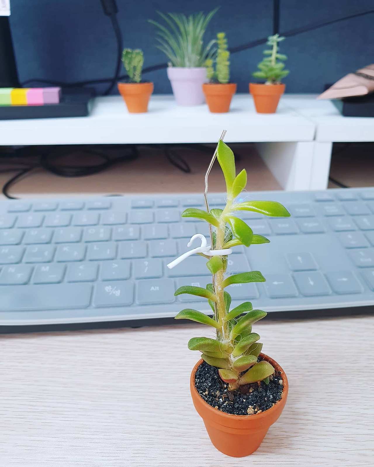 다육이들 중에서도 이 아이가 특히 너무 많이 자라서 옆으로 휘기 시작했다. 어느 주말을 보내고 오니 거의 옆으로 90도 가까이 누우려 해서 깜짝 놀랐다. 같은 파트 동료가 클립을 쭉쭉 펴더니 화분에 푸욱 꽂아주었다. 솔로몬인 줄 알았다. 생각보다 간단하게 해결할 수 있었다. 잭과 콩나무도 아니고 무슨 식물이 이렇게 잘 자라나 싶었다. 이제는 뿌듯함을 넘어 분갈이에 대한 압박이 다가왔다. 식물이라고 마냥 손이 안 가는 것도 아니구나.