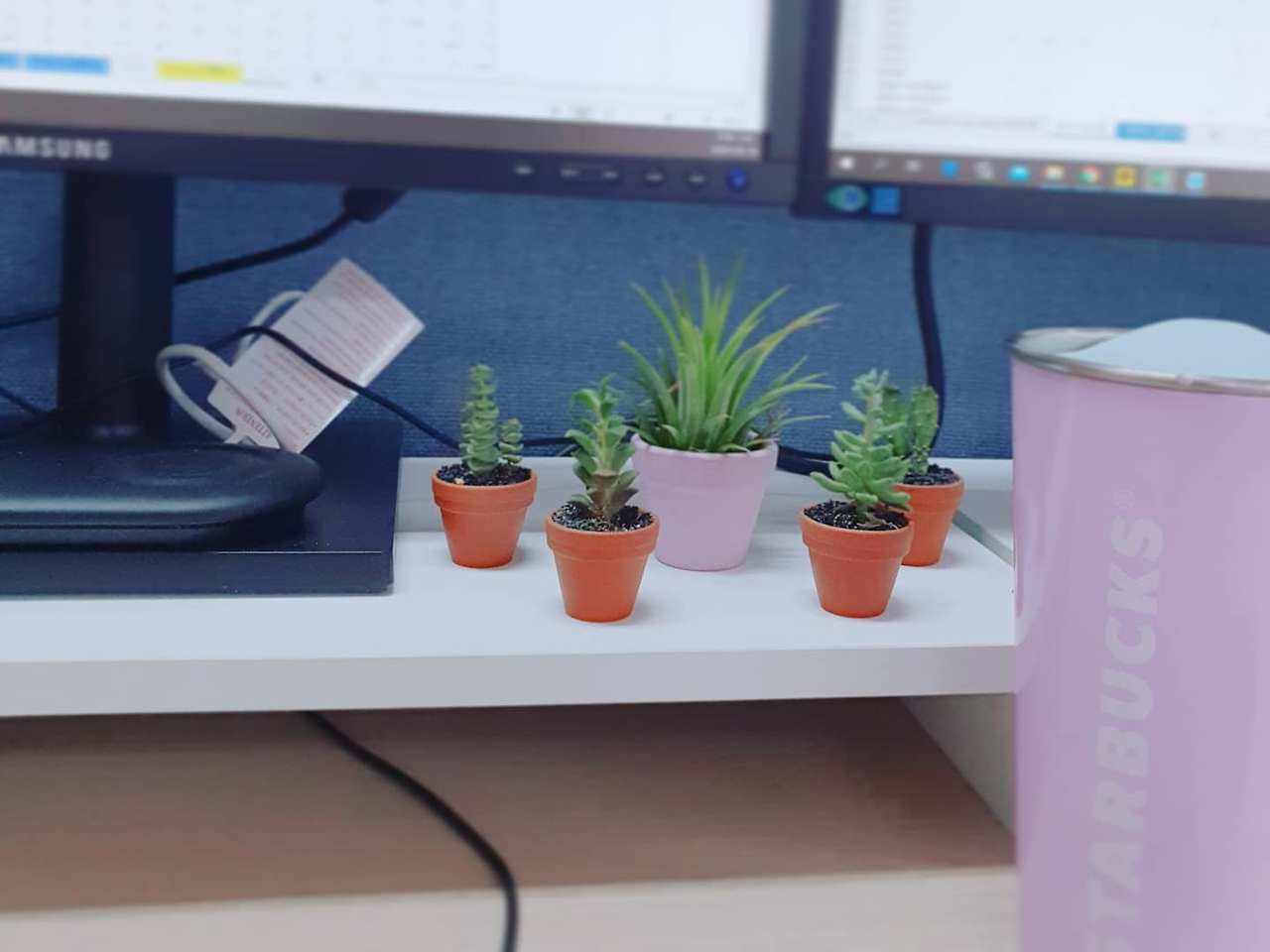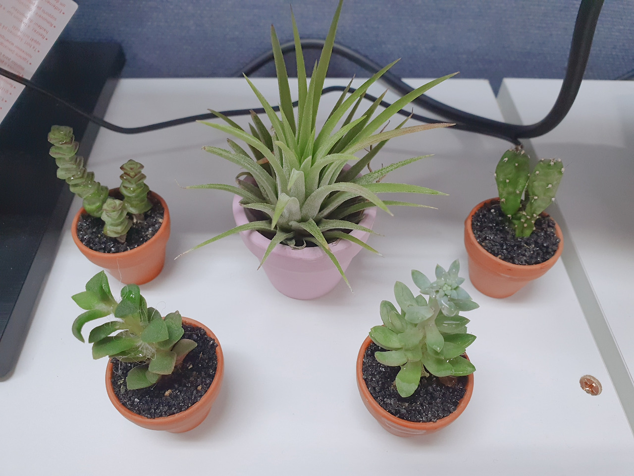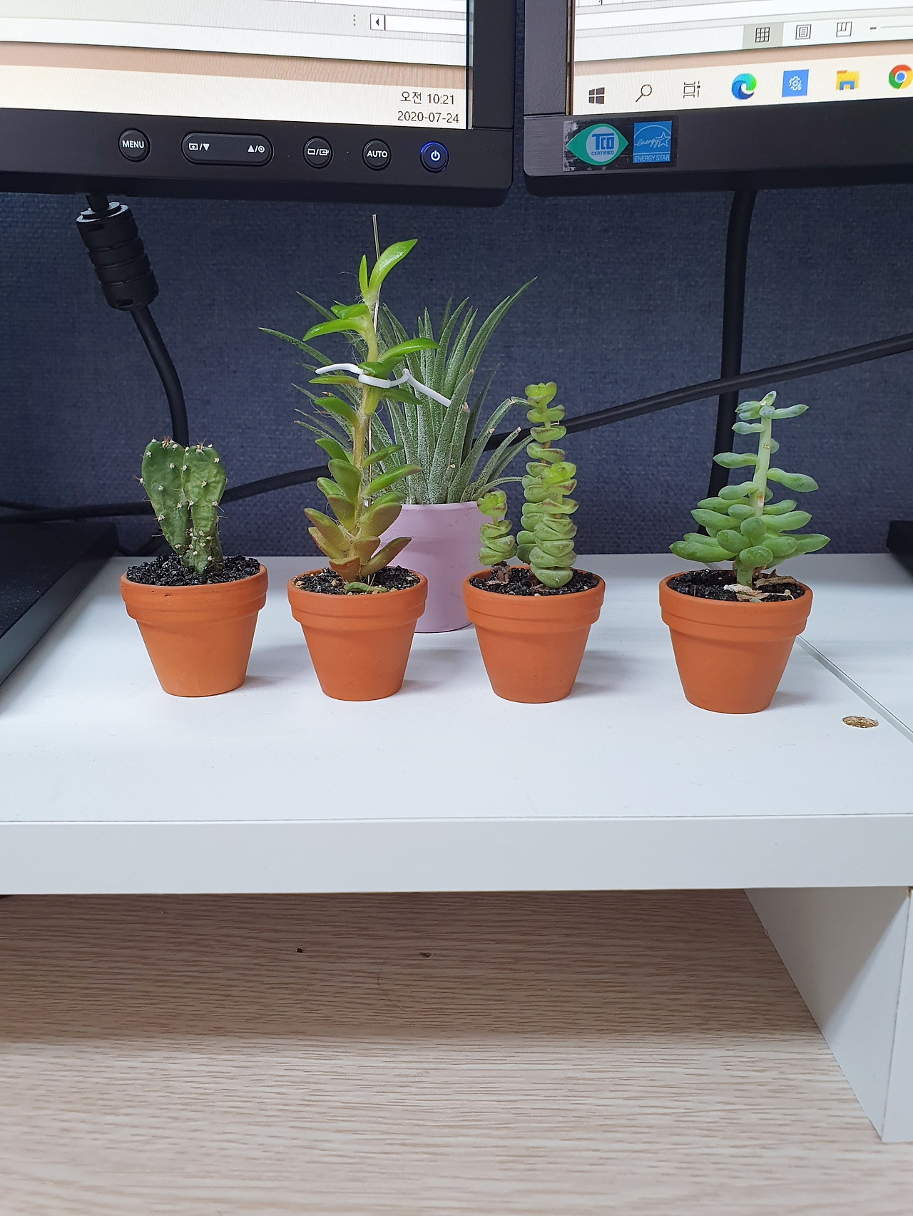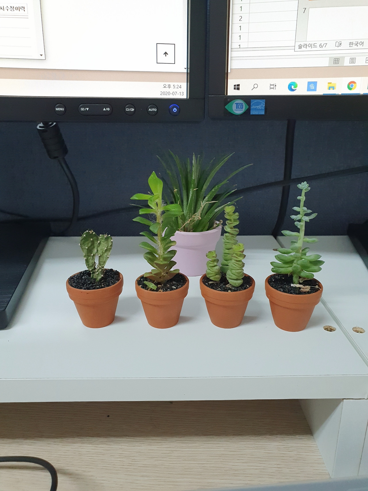 갓 입사하고 한 일주일쯤 됐을 때다. 하루 온종일 있는 회사가 어딘가 삭막하게 느껴졌던 것 같다. 점심시간 근처 꽃집에 가서 미니 다육이 다섯 명을 데려왔었다. 다육이는 손이 많이 가지도 않고 알아서 내버려두면 잘 큰다길래 편한 마음으로 데려왔다. 작고 귀여운 다육이들을 눈 가장 많이 가는 모니터 바로 아래에 두었다. 자리가 초록초록해지자 마음이 한결 위안이 되었다. 식물이란 생명체가 그런 것 같다.